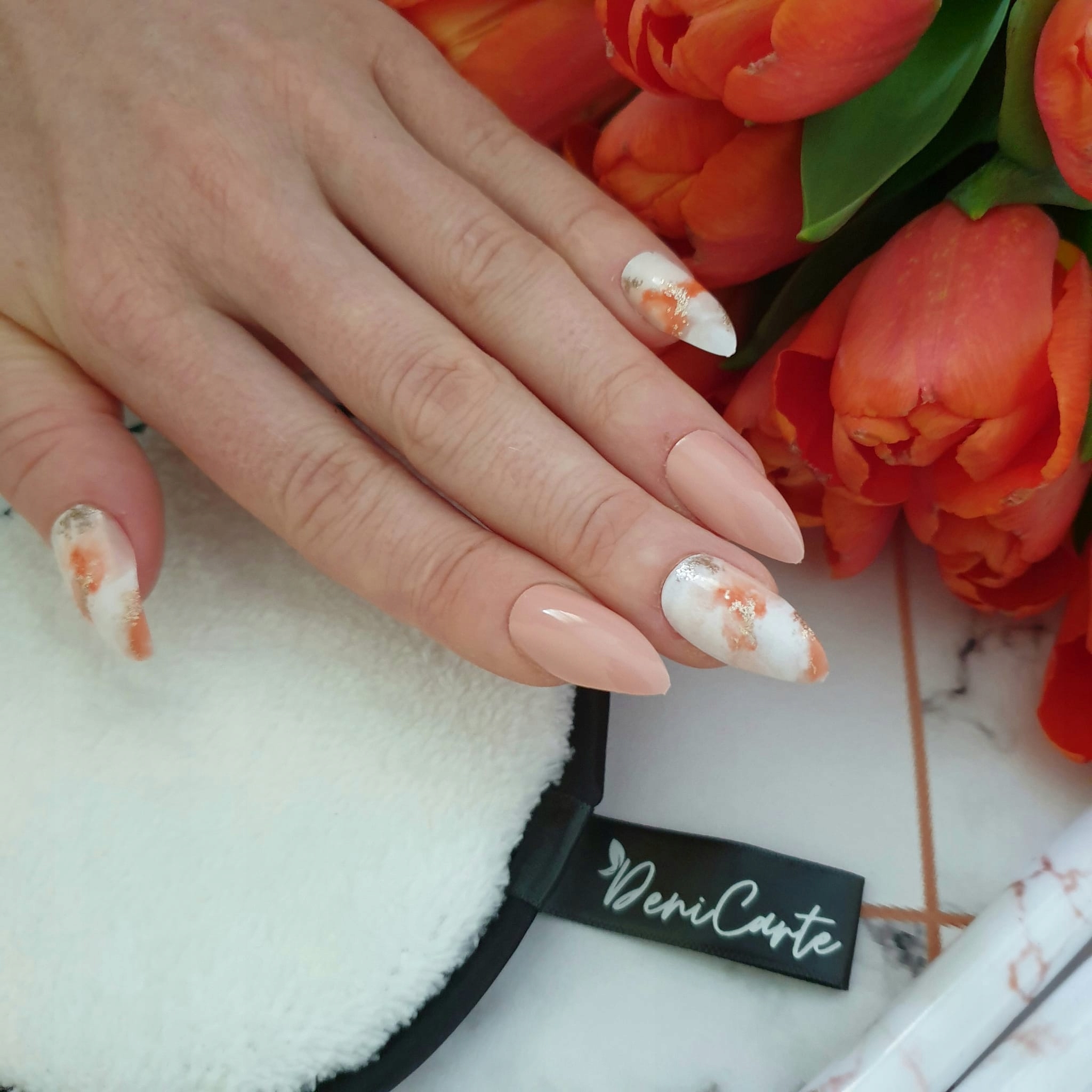 ✔️Выбранная модель выполнена в красивом блестящем цвете в оттенках абрикосовый с декоративным мотивом под мрамор. Ногти миндалевидной формы.