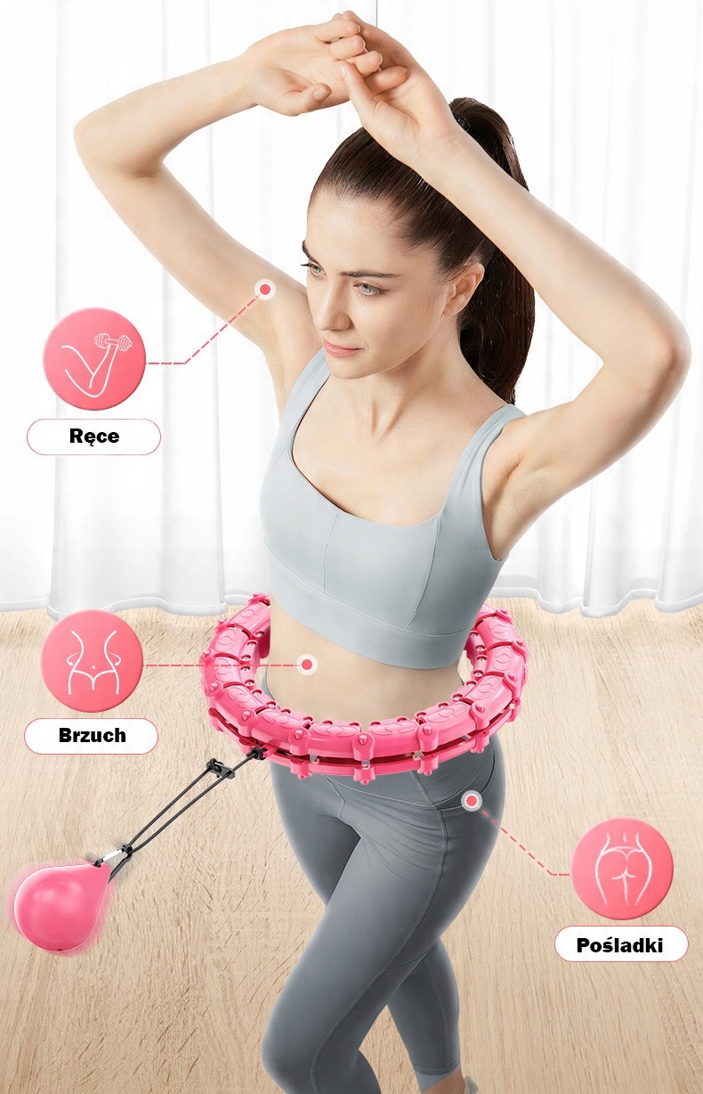 Обруч состоит из 24 съемных сегментов, что позволяет легко подогнать устройство под свою фигуру. Регулируемая окружность от 50 см до 107 см, что делает обруч универсальным и подходящим для каждого. Дополнительный вес вращается за счет центробежной силы, что повышает эффективность тренировки.