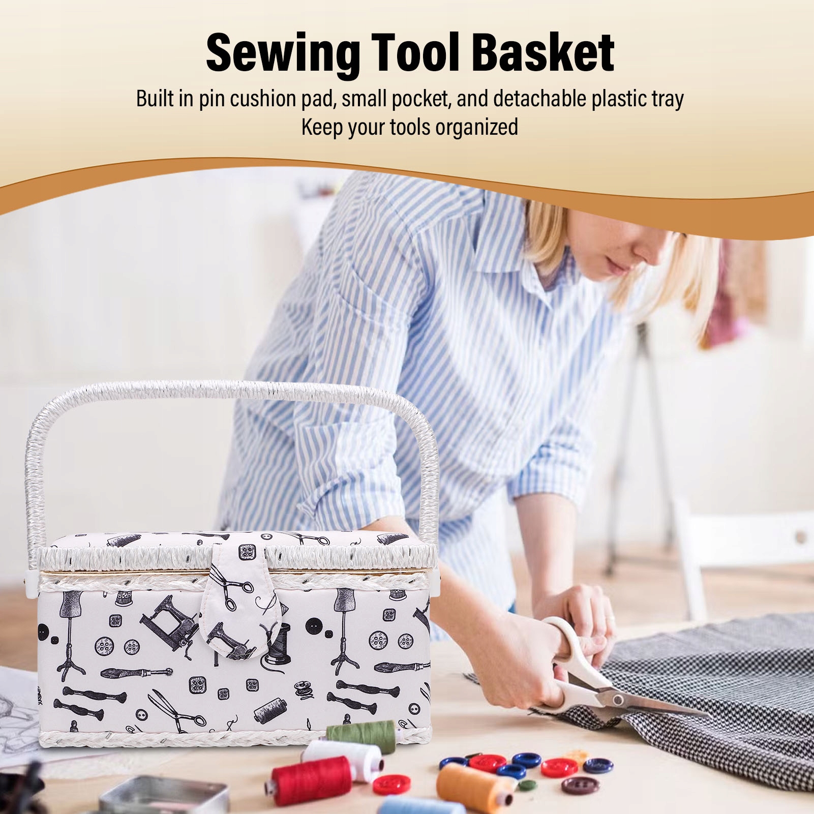 1. Корзина для шитья: Корзина для шитья имеет встроенную игольную подушку, небольшой карман и съемный пластиковый лоток для хранения швейных принадлежностей.