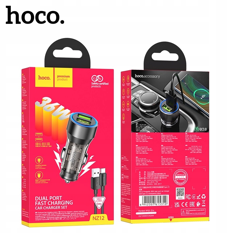hoco nz12 Prosperity -это быстрое, сильное автомобильное зарядное устройство с двумя USB-выводами с мощностью 18 Вт до каждого. Максимальная мощность общего зарядного устройства с использованием как выходных разъемов и зарядки двух устройств одновременно составляет 36 Вт. Зарядное устройство также имеет всю текущую защиту и аттестацию и сертификаты, позволяющие продавать и использовать в Европейском союзе. Длина кабеля, доступная в наборе с зарядным устройством, составляет около 1 м / 100 см. Зарядное устройство привело к свету в форме круглого диода.