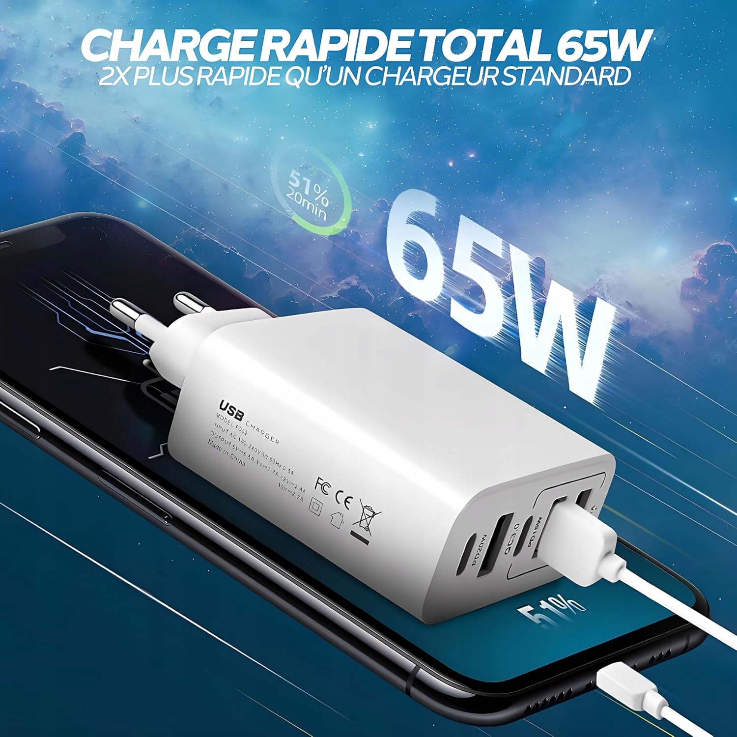 ШВИДКИЙ МЕРЕЖЕВИЙ ЗАРЯДНИЙ ПРИСТРІЙ 65 Вт: 2x USB-C PowerDelivery 3x USB-A QC 3.0 білий