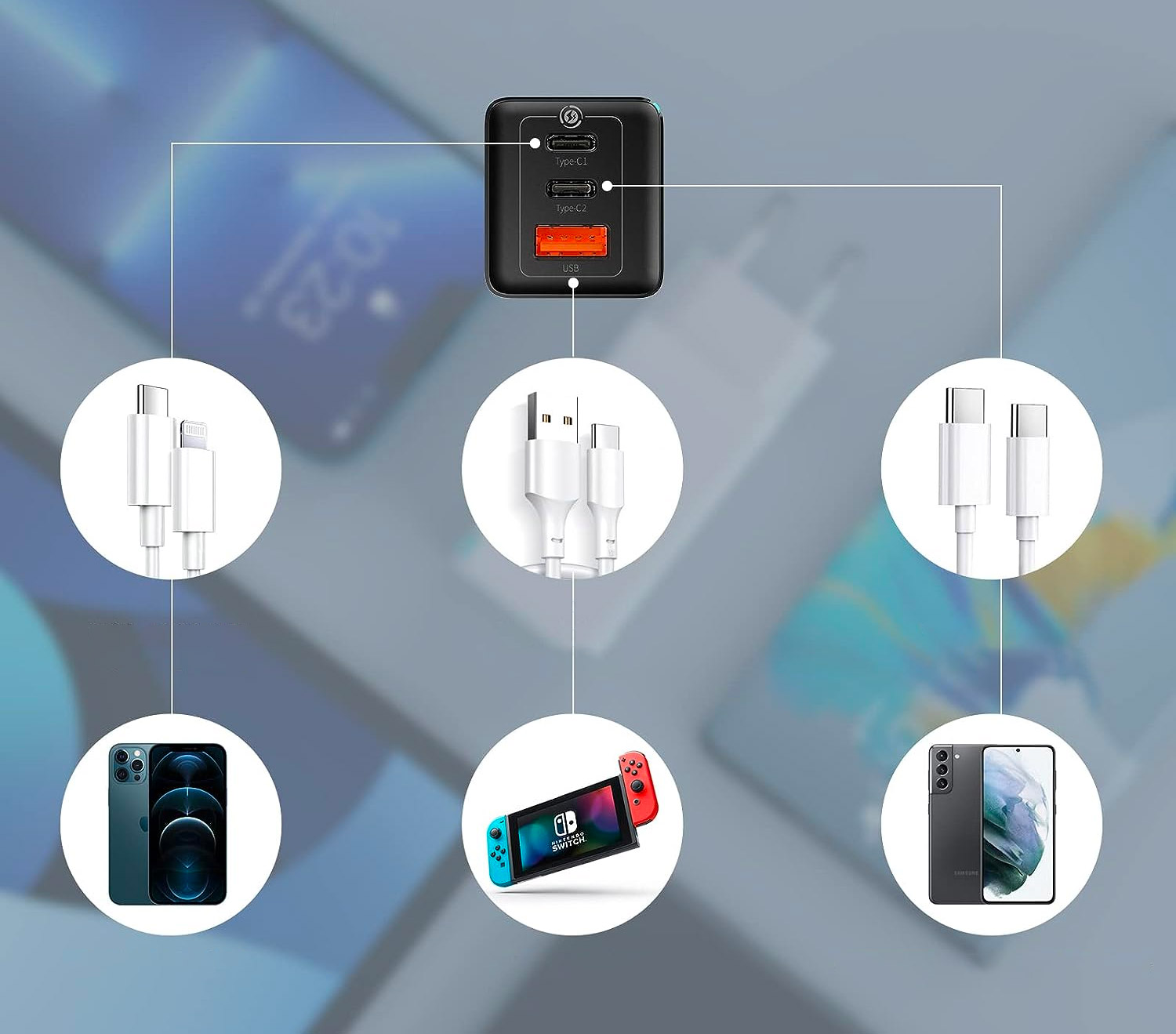 - Можно заряжать три устройства одновременно - Зарядное устройство с 3 портами USB-C и USB-A идеально подходит для требовательных пользователей. Нет очередей!