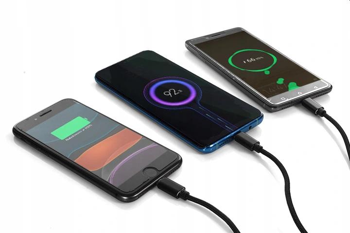 Прочный USB-кабель из нейлоновой оплетки с тремя различными типами разъемов.