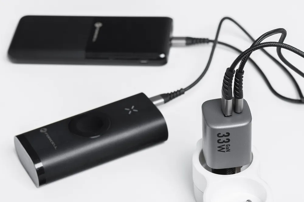 Сетевое зарядное устройство Forcecell, выполненное по технологии GAN, общей мощностью 33 Вт. Оно поддерживает стандарты зарядки Quick Charge 4.0 и Power Delivery, что позволяет моментально заряжать телефоны и планшеты, поддерживающие быструю зарядку. Два порта — USB-A и USB-C — позволяют заряжать два устройства одновременно.
