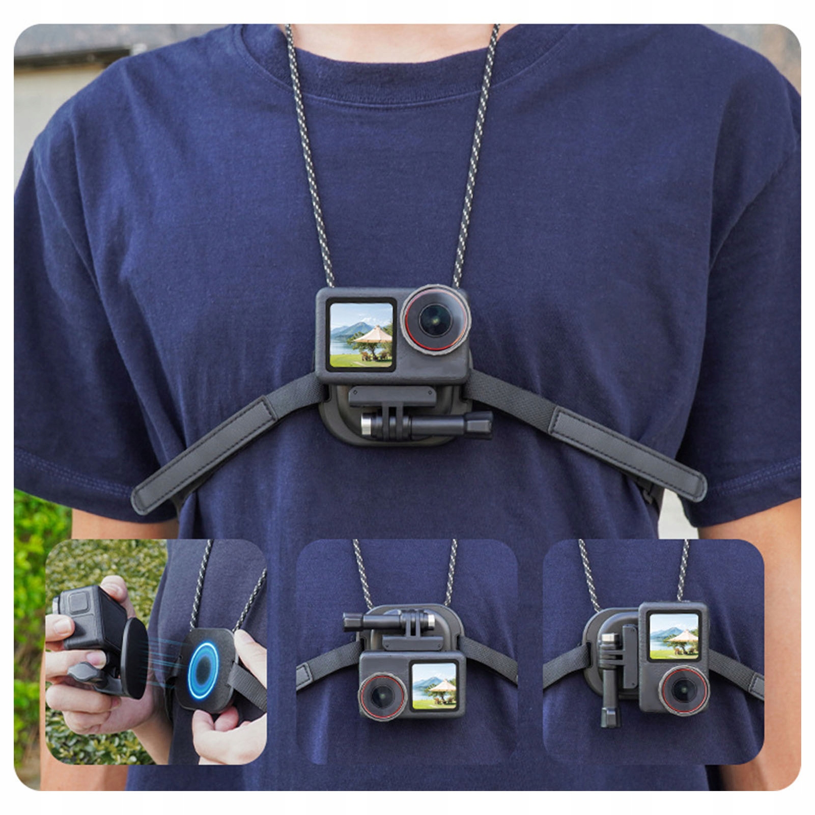 1. [Высокая стабильность] Магнитное шейное крепление поставляется с нагрудным фиксирующим ремнем, обеспечивающим безопасную и надежную установку камеры, уменьшая тряску в интенсивных условиях.