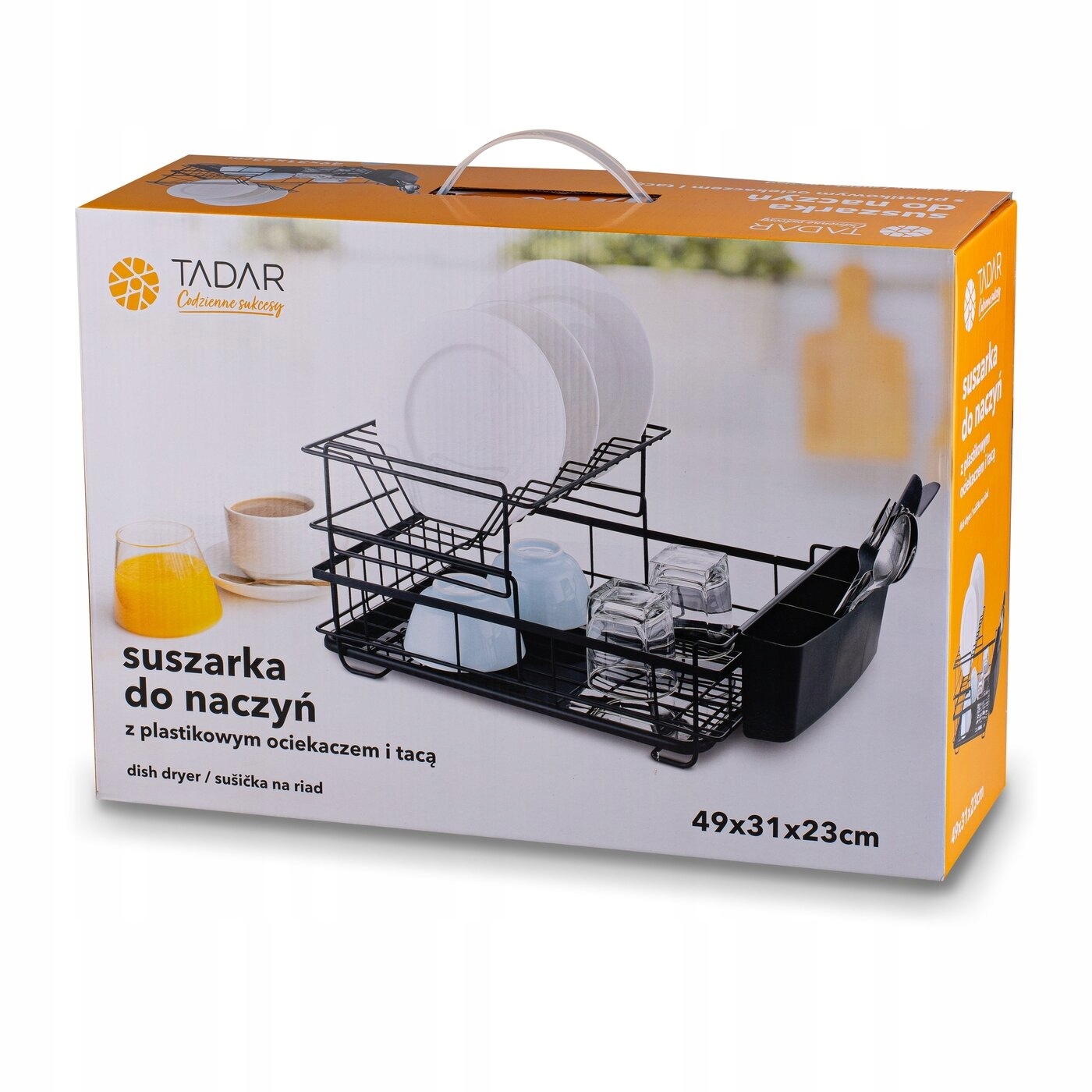 Черная двухуровневая сушилка для посуды Tadar 43 х 29,5 х 23 см прочная и добротная. Вместе с ним вы получаете поднос и подходящую сушилку для столовых приборов, разделенную на 3 части. Все сделано из пластика и металла с порошковым покрытием. Он также устойчив к влаге и прост в уходе. Его устойчивая конструкция позволяет легко разместить его рядом с раковиной. Он займет мало места на домашней кухне и очень вместительный. Он предназначен для безопасной и гигиеничной сушки посуды (тарелок, стаканов, чашек и кружек). Он также хорошо отводит капающую воду и ускоряет высыхание посуды благодаря отличной вентиляции. Слив воды осуществляется быстро и без проблем. Изделие также легкое, поэтому вы легко сможете поменять его место или снять со столешницы для чистки. В нем можно разместить до 10 тарелок различных типов и размеров. Это также поможет вам навести порядок и организовать пространство возле раковины. Верхний уровень является съемным, и после установки вы можете быть уверены, что он случайно не упадет даже при перемещении сушильной машины из одного места в другое.