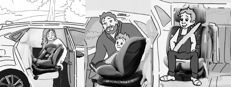 - устанавливается с помощью 3-точечного автомобильного ремня (100–150 см) по направлению движения; сиденье поддерживается стабилизирующей ножкой
