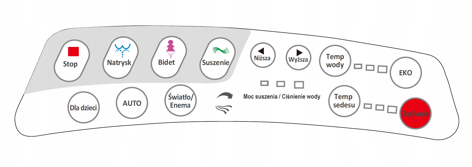 • Функция мойки задней и передней части с использованием неограниченного количества горячей воды (мощность нагрева: 1350 Вт, расход воды 0,5–0,9 л/мин, возможность регулировки температуры: комнатная, 30°C, 35°C, 40°C).
