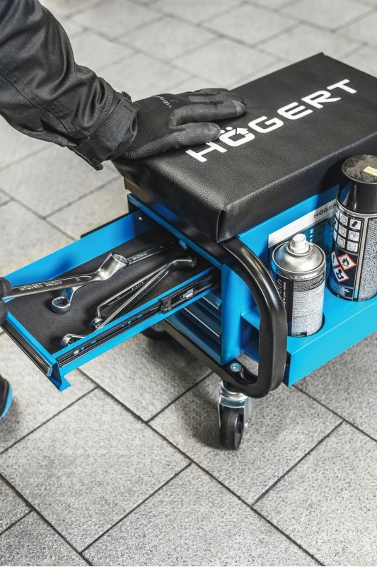 Стуло для мастерской с тремя ящиками – практичное и функциональное решение для людей, работающих в мастерских, гаражах или других местах, где необходим комфорт и хорошая организация рабочего места. Это удобное сиденье, оснащенное тремя ящиками, обеспечивает легкий доступ к инструментам и мелким предметам, что облегчает работу и повышает комфорт и эффективность.
