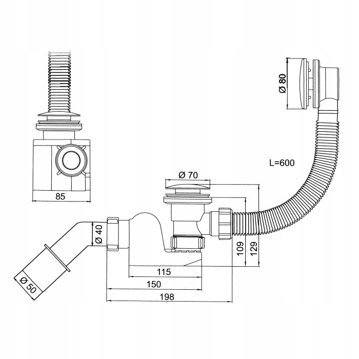 - длина переливной/складной трубы до 600 мм!