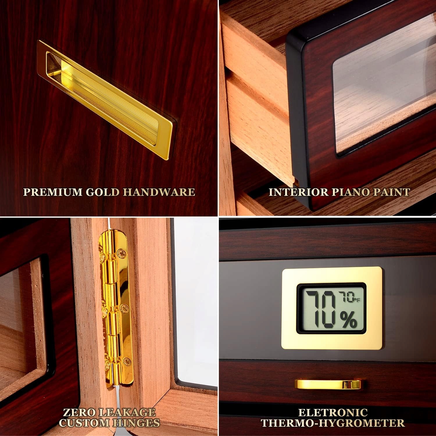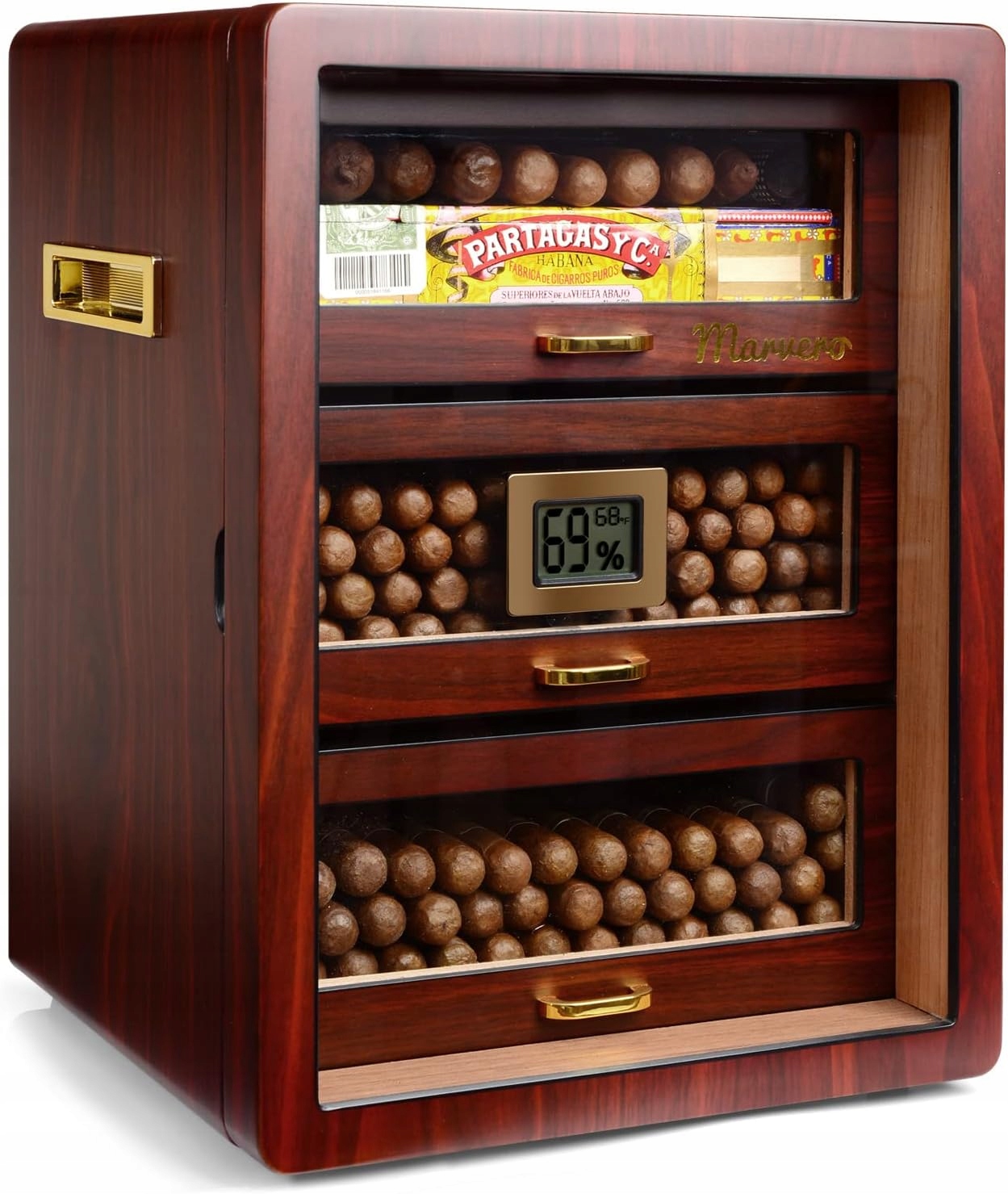 Хьюмидоры для сигар ручной работы Marvero, хьюмидор из кедрового дерева на 150 сигар с цифровым гигрометром, 3 больших ящика из коричневого ореха, 3 увлажнителя и золото.