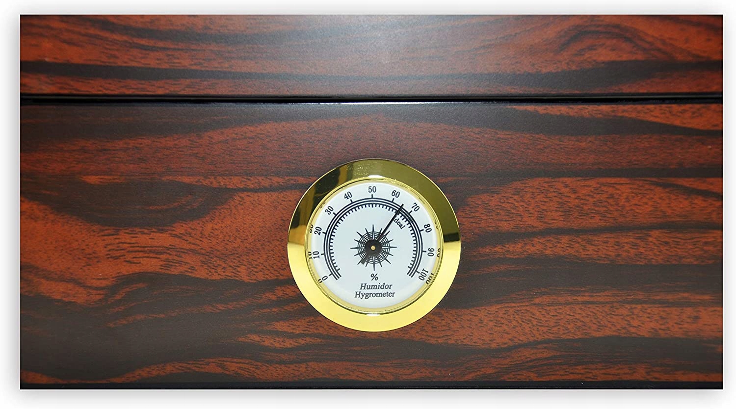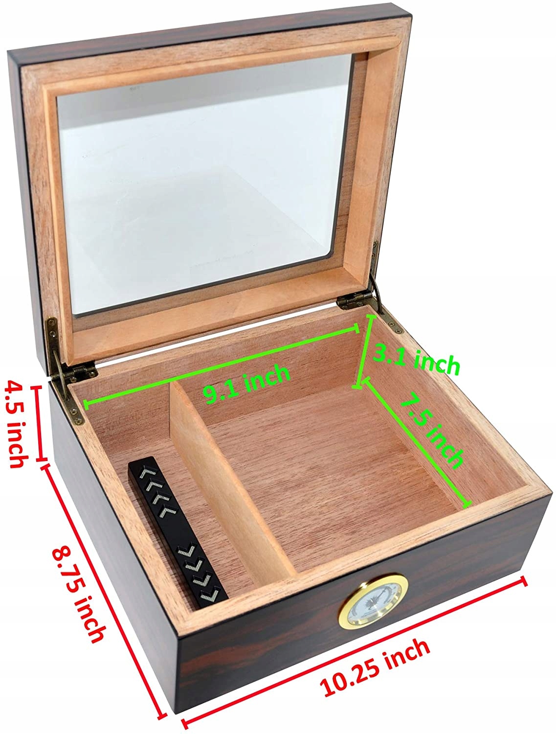 Назначение: аутентичный испанский кедр. Интерьер с превосходным ароматом, вместимость от 20 до 50 сигар (в зависимости от диаметра сигары). Полезно: верхняя часть из закаленного стекла для удобства осмотра, надежная пломба на крышке ручной работы, согласно инструкции, заполнение увлажнителя, наблюдение за гигрометром для создания системы удержания влаги, сохранят ваши сигары свежими на долгие годы. (Сигары в комплект не входят). Потрясающая коричнево-черная отделка Macassar с декоративной черной полосой эспрессо по всем краям, петли цвета старинной меди и устойчивое к царапинам бархатное основание создают стильную винтажную модель, подходящую к любому интерьеру. Технические характеристики: Приблизительные внутренние размеры хьюмидора: 9 1/8 дюйма Ш x 7 1/2 дюйма Г x 3 1/8 дюйма В. Съемная кедровая перегородка помогает закрепить сигары в коробке. Общий внешний размер: 10 1/4 дюйма Ш x 8 3/4 дюйма x 4 1/2 дюйма в. Заказывайте с уверенностью: вы можете получить полный возврат средств, если вы не удовлетворены качеством. Заказывайте без забот, нажмите и добавьте в корзину прямо сейчас! Мы уверены, что кедровый хьюмидор вам понравится.