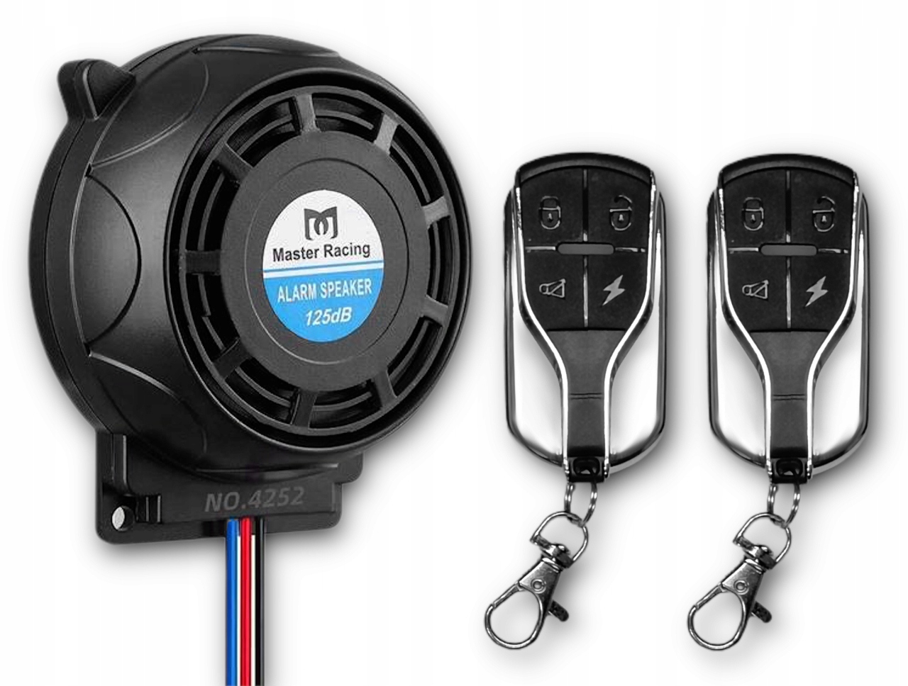 Защита для скутера, квадроцикла или мотоцикла. Встроенный датчик удара. Простая установка предполагает монтаж сирены/блока управления и подключение источника питания: красного на плюс 12В и черного на минус 12В. На пультах дистанционного управления имеются кнопки постановки на охрану, снятия с охраны и тревожной тревоги. Первый удар вызывает так называемую предварительную тревогу, следующий активирует режим тревоги.