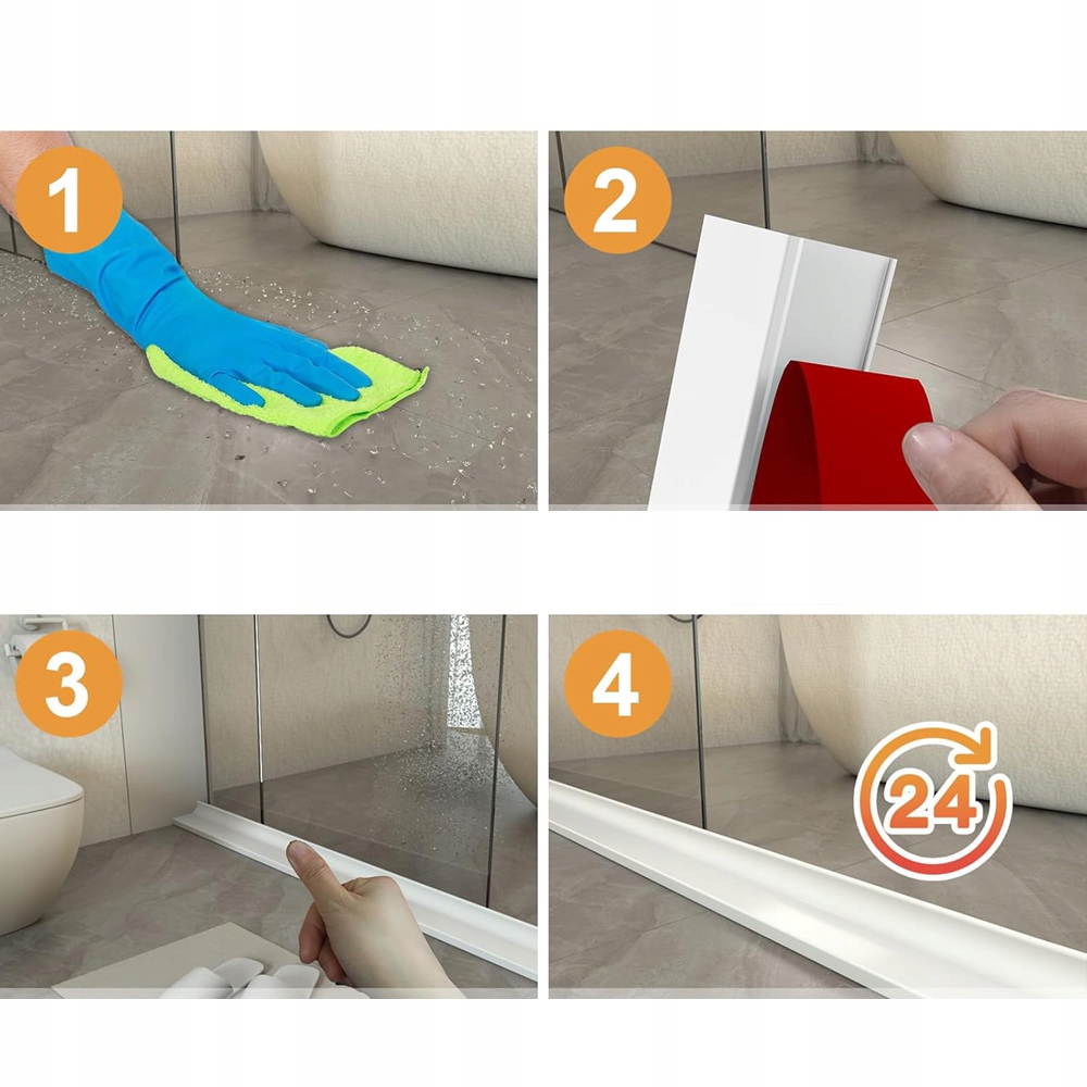 ✔️Быстрая установка - эффективно блокирует поток воды: силиконовая пробка защищает от брызг душа, прочная самоклеящаяся и легко устанавливается. ① Очистите и высушите пол. Отметьте положение и приклейте порог душа и уплотнитель душа в отмеченное место. ③ При установке плотно прижмите уплотнитель душевой двери. ④ Высушите не менее 24 часов без воздействия воды.