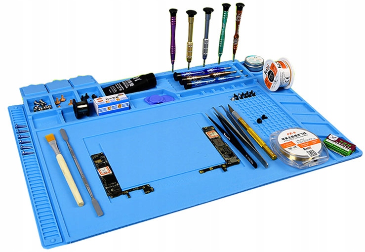 Силиконовый гибкий изолирующий коврик размерами 39см х 27см предназначен для размещения на столе для обслуживания электроники. Устойчив к высоким температурам при пайке, до 500°C. Таким образом, он защищает столешницу от механических повреждений и высоких температур при работе термовоздушным паяльником с горячим воздухом. Мягкий на ощупь, он не оставит царапин на отремонтированных изделиях, таких как смартфоны или планшеты. Коврик имеет ряд выступов для хранения, например, винтов и других небольших электронных компонентов SMD. Коврик предназначен для обслуживания электроники и компьютеров. GSM-услуги. Позволяет поддерживать порядок на сервизном столе (его легко мыть).