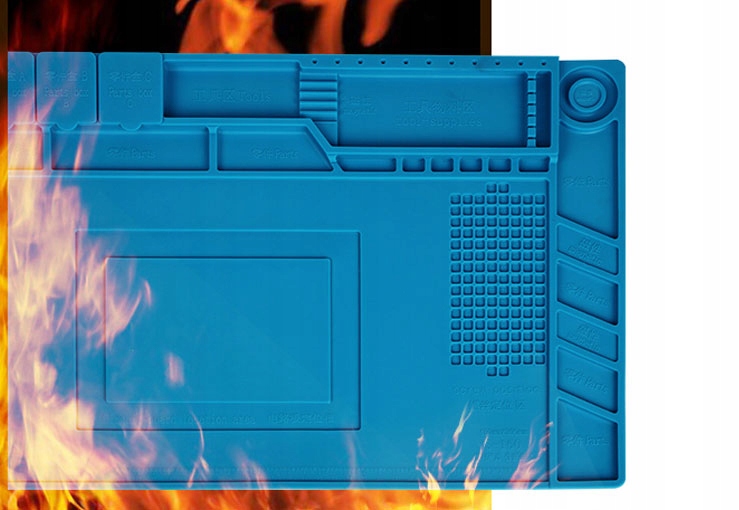 Силиконовый гибкий изолирующий коврик размерами 48см х 32см предназначен для размещения на столе для обслуживания электроники. Устойчив к высоким температурам при пайке, до 500°C. Таким образом, он защищает столешницу от механических повреждений и высоких температур при работе термовоздушным паяльником с горячим воздухом. Мягкий на ощупь, он не оставит царапин на отремонтированных изделиях, таких как смартфоны или планшеты. Коврик имеет ряд выступов для хранения, например, винтов и других небольших электронных компонентов SMD. Коврик предназначен для обслуживания электроники и компьютеров. GSM-услуги. Позволяет поддерживать порядок на сервизном столе (его легко мыть).