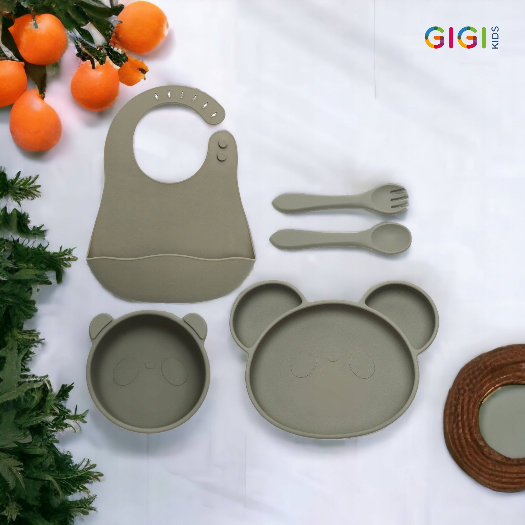НАБОР из 5 штук силиконовой посуды для детей, цвет хаки: