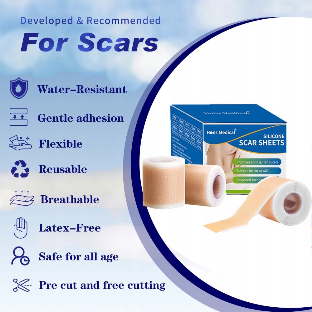 Срезы для шрамов из 100% медицинского класса силикона. Идеально подходит для лечения новых и старых шрамов, способствующих их естественному исцелению. Силикон обеспечивает кожу влаги, снижая видимость шрамов и улучшая ее текстуру.