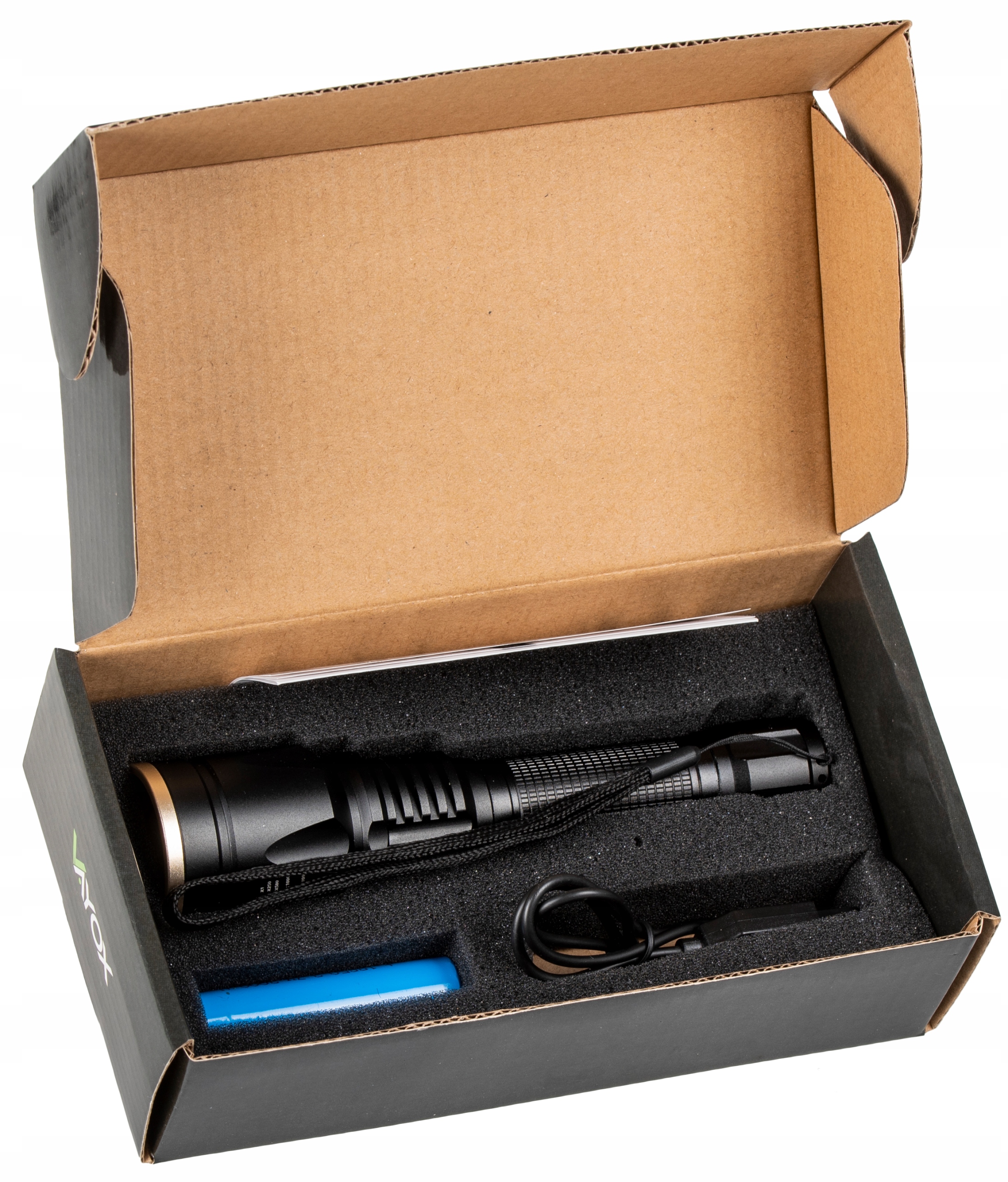 - В комплекте: 1 аккумулятор 18650, ремешок на руку, USB-кабель