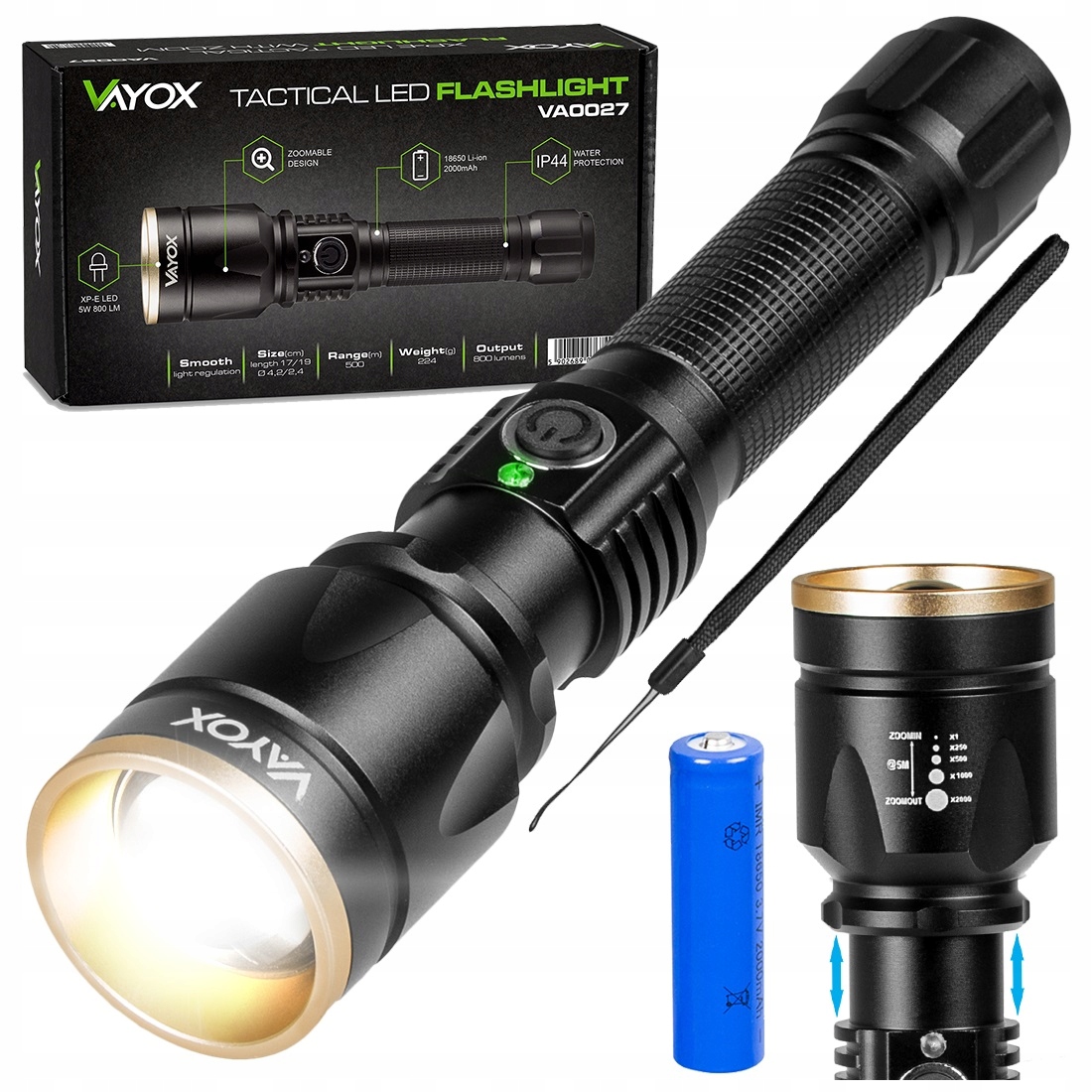 МОЩНЫЙ СВЕТОДИОДНЫЙ ТАКТИЧЕСКИЙ ФОНАРЬ С БАТАРЕЕЙ ZOOM USB IPX VAYOX