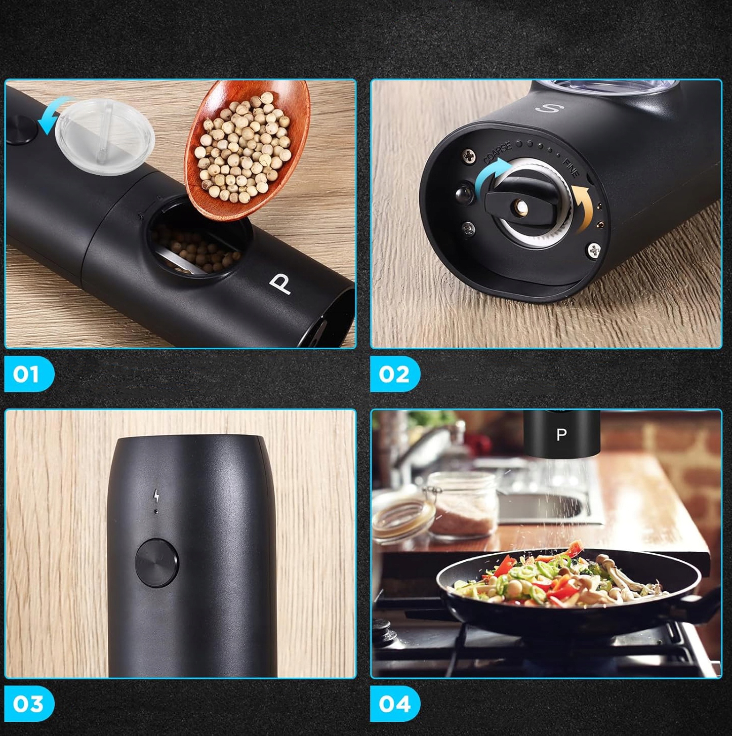 ✔✔✔【Широкий диапазон Применение】Может использоваться для перца, соли и специй. Эта электрическая мельница для соли и перца подходит для всех видов специй. Идеально подходит в качестве приправы к перцу, соли, паприке, гвоздике, травам и смесям специй. Идеально подходит для кухни, гриля на открытом воздухе и в ресторанах.