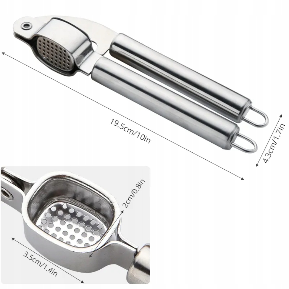Чеснокодавилка изготовлена из высококачественной нержавеющей стали. В отверстие помещается целый зубчик чеснока. >