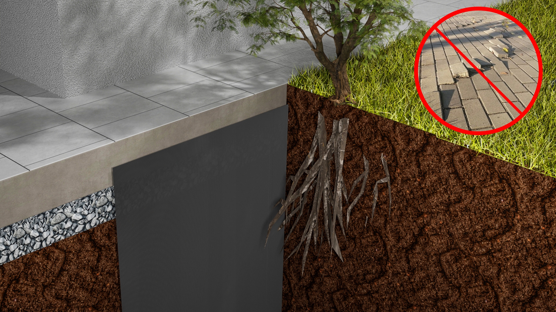 экрана от корневого барьера, b> эффективно защищает основы зданий и морить камни от повреждения, вызванного корнями деревьев. Окружая булыжники, плитки и т. Д., Это предотвращает проникновение корней, которые могут вызвать выпуклости.