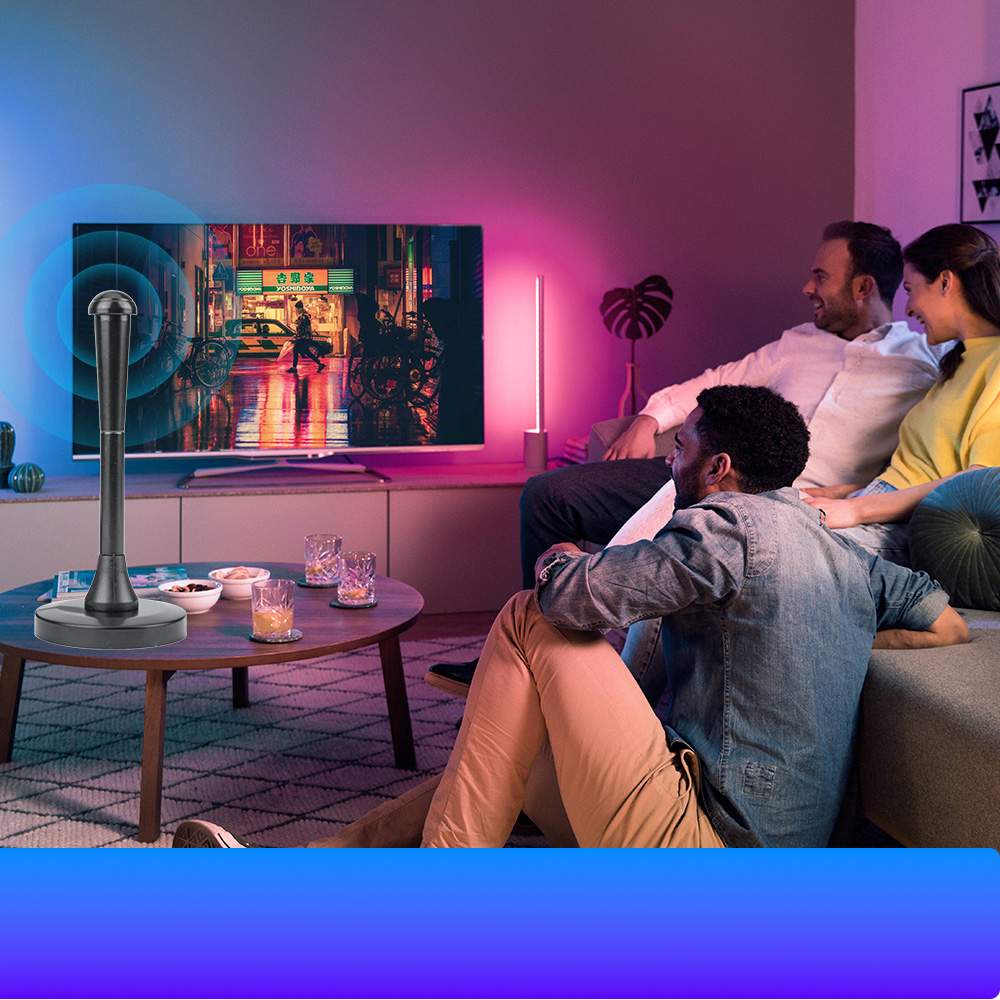 Эта интеллектуальная телевизионная антенна оснащена улучшенным усилителем сигнала. Встроенная интеллектуальная интегрированная схема оптимизирует передачу сигнала, обеспечивая максимальный диапазон до 450 км. Вы можете посмотреть каналы Full HD, 1080p и 4K UHD, а также бесплатно больше местных каналов! Попрощайтесь с высокими ежемесячными телевизионными счетами или спутниковым телевидением!
