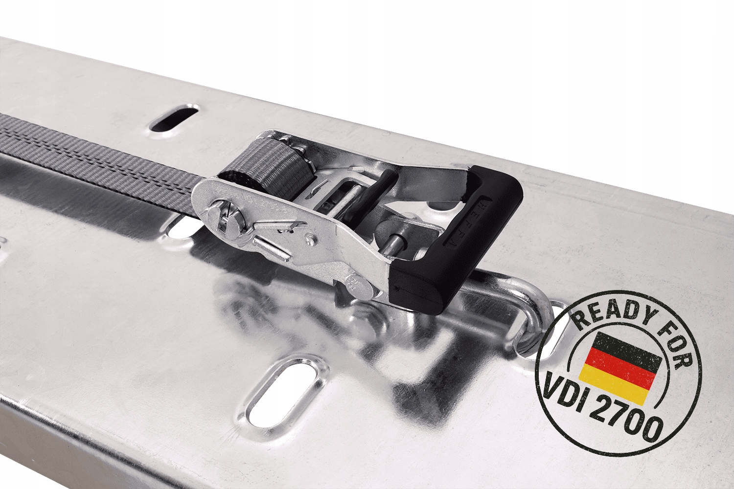 Директива VDI 2700 Часть 8.1 - это немецкий технический стандарт, определяющий подробные требования к для защиты транспортных средств, транспортируемых на эвакуаторах и прицепах . Что касается привязанных ремней, с обертыванием круга, эта директива указывает, среди прочего, метод распределения ремней, необходимое количество монтажных точек (например, 3-точечная система), параметры минимального напряжения и правила для их маркировки и технического госпитализации. Соответствие VDI 2700 8.1 означает, что ремни соответствуют строгим требованиям в области безопасности, надежности и эффективности иммобилизации транспортируемого транспортного средства, что имеет решающее значение для профессионального транспортировки легковых автомобилей и фургонов. Благодаря этому пользователь уверен, что используемая система крепления соответствует нынешним европейским и немецким стандартам в области безопасности дорожного движения.