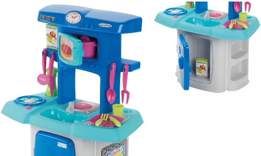 Кухня приспособлена для развлечений на трех уровнях. На первом уровне расположена духовка и две боковые полки для продуктов. Второй уровень состоит из трех частей – мойки, плиты и столешницы. Третий уровень – устройство для розлива сока и полукруглая полка для соли и специй. В комплект входит набор столовых приборов, кухонной утвари, продуктов питания и специй. Всего 14 элементов.