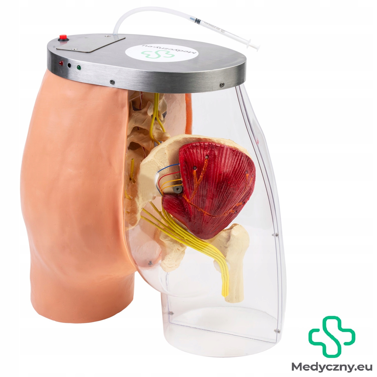 Инновационный симулятор внутримышечных инъекций, со световыми индикаторами, указывающими на правильность инъекции, и красной сигнальной лампой при неправильном введении иглы. Модель представляет собой копию ягодиц. Сконструирован необычным образом.