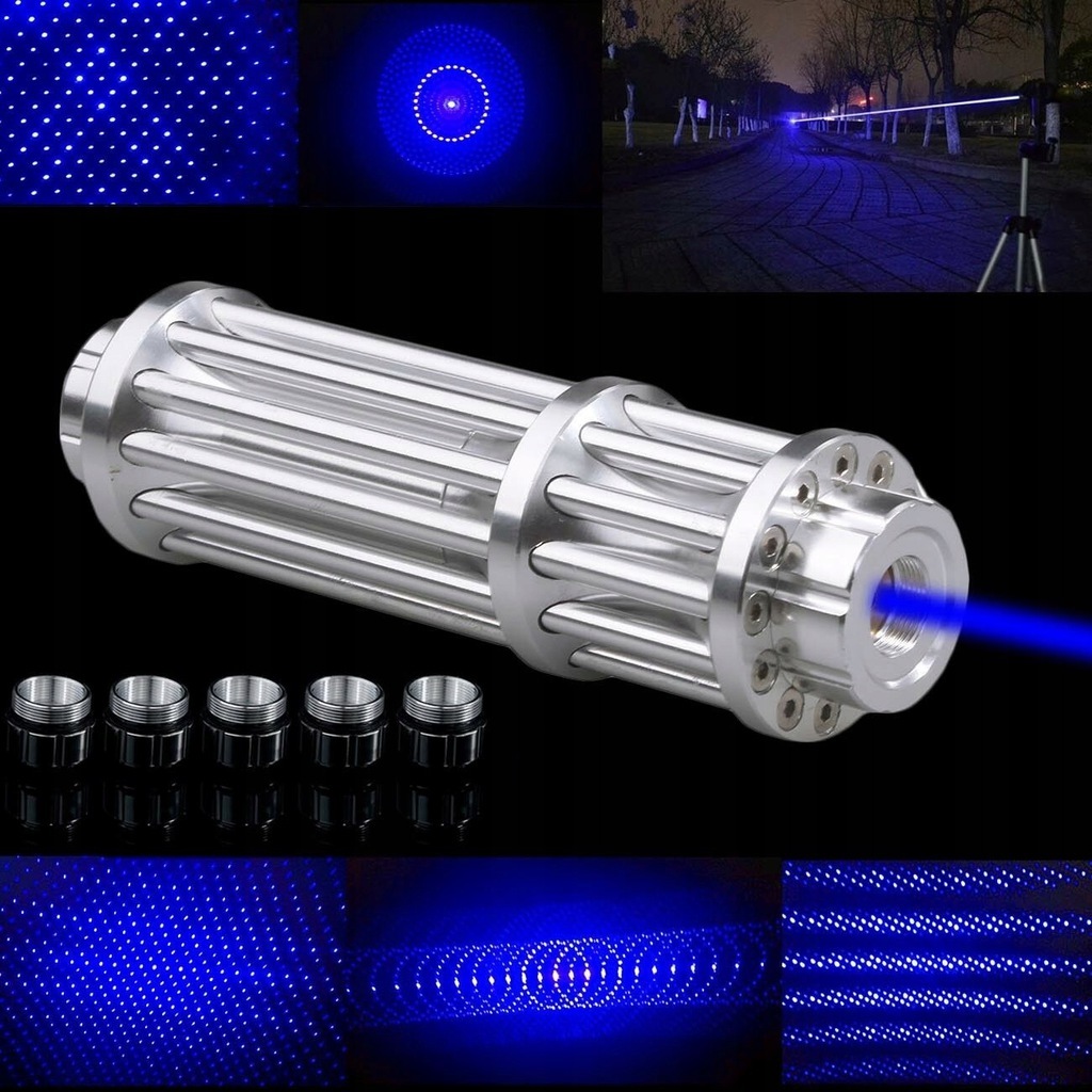 Blue Laser с очень высокой мощностью, с заменяемыми диско -головками, представляет собой профессиональный инструмент из лучших и самых долговечных материалов, доступных на рынке. Он устойчив к различным рабочим и атмосферным условиям. Корпуса (анодированный алюминий) обеспечивает удобство, долговечность и обеспечивает долгосрочное использование. Использование такой высокой мощности проще сжигает различные вещи, такие как: бумага, древесина, пластик, фольга и настройки на матчах из нескольких метров. Ночью лазерный луч, направленный на небо, виден из нескольких десятков километров - в зависимости от поля и атмосферных условий. Его луч также виден при дневном свете