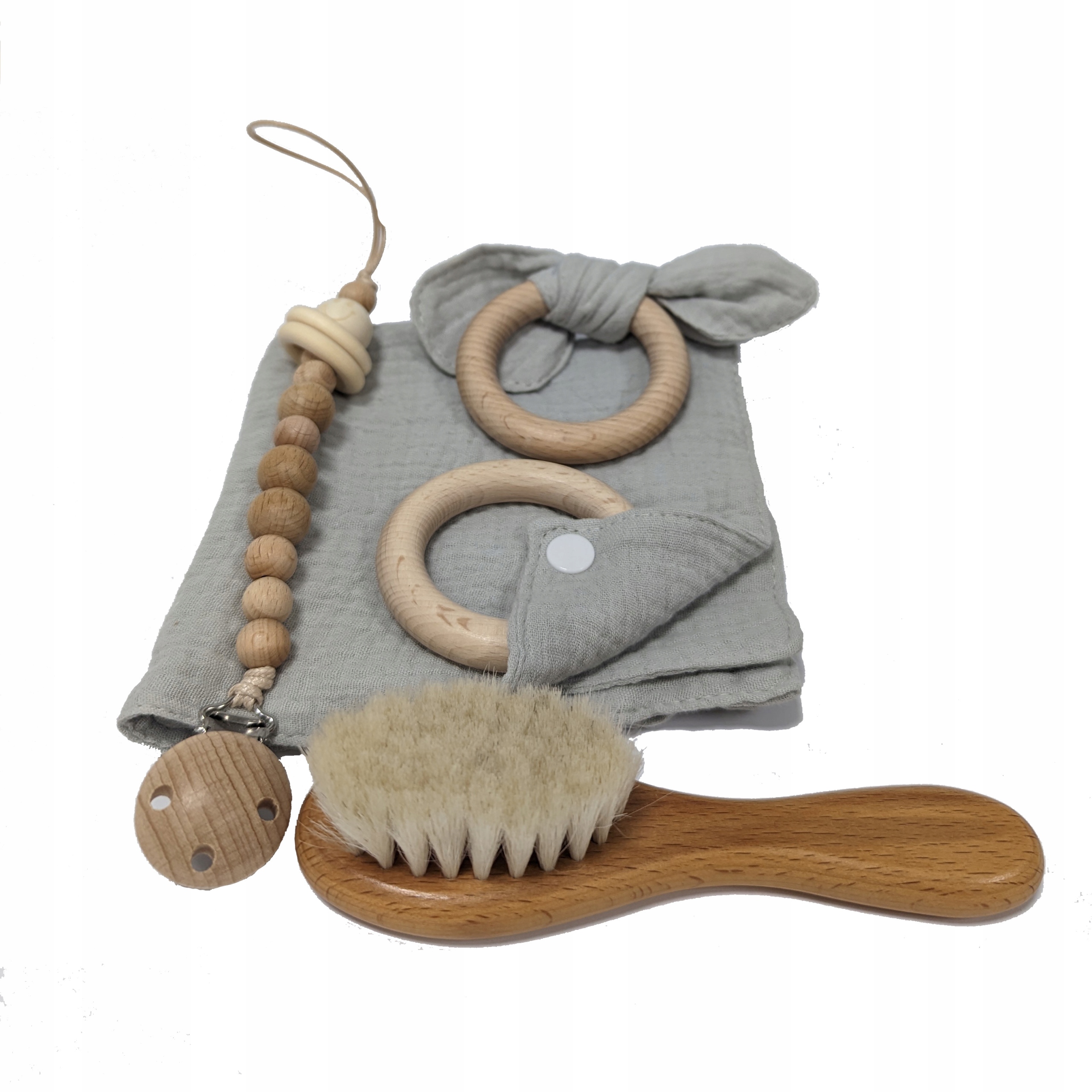 Подгузник отлично подойдет в первые минуты жизни вашего ребенка, выступая в качестве средства для пеленания или отрыжки. Практичный держатель для соски гарантирует, что ребенок не потеряет ее и соска всегда будет с ним. Деревянный прорезыватель с бантиком покорит сердце каждого малыша. Естественная форма наших игрушек будет стимулировать любопытство самых маленьких детей и побуждать их к исследованиям. Щетка с мягкой щетиной — полезный инструмент для ухода за ребенком, особенно в контексте ухода за нежной кожей головы и волосами ребенка.