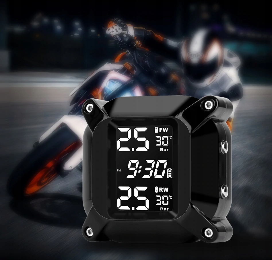 Интеллектуальная система контроля давления в шинах в режиме реального времени. Он оснащен двумябеспроводными датчиками, привинченными к вентилю колеса. Водонепроницаемый блок управления устройством оснащен четким дисплеем, информирующим о текущем давлении и температуре в каждом из колес автомобиля. Эргономичная форма блока управления системой TPMS и специальная ручка позволяют прикрутить его к рулю. Устройство оснащено емким аккумулятором, обеспечивающим длительное время работы, а специальное магнитное зарядное гнездо облегчает зарядку блока управления. Электронная система управления энергопотреблением оснащена датчиком движения и после длительного простоя блок управления переходит в спящий режим.