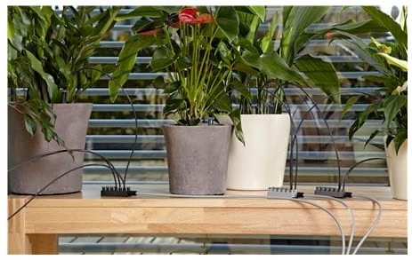 Автоматическая лейка GARDENA - полностью автоматическая система капельного орошения, рассчитанная на 36 горшечных растений. Имеет насос, который включается один раз в день на 1 минуту через трансформатор с таймером и подает растениям воду из емкости, в которой он помещен. Через сеть распределителей и оросительных шлангов вода попадает туда, где она необходима. Чтобы учесть различия в потребности разных растений в воде, имеются 3 распределителя с разным расходом воды, каждый с 12 выходами для точного дозирования воды – от 15 мл в минуту до 30 мл (максимум 60 мл) в минуту. В комплект входит трансформатор с таймером, насос с фильтром, 3 водораспределителя по 12 выходов каждый, 9 метров раздаточного шланга, 30 метров шланга для подачи воды к растениям, 36 монтажных шпилек, 20 колпачков.