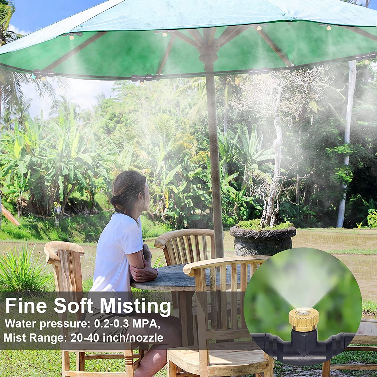 Благодаря трубкам, устойчивым к ультрафиолетовому излучению, система наружного туманообразования выдерживает воздействие солнца и погодных условий. Прочные латунные насадки из нержавеющей стали, герметичный соединитель для трубки, адаптер для смесителя из твердой латуни рассчитаны на длительный срок службы.