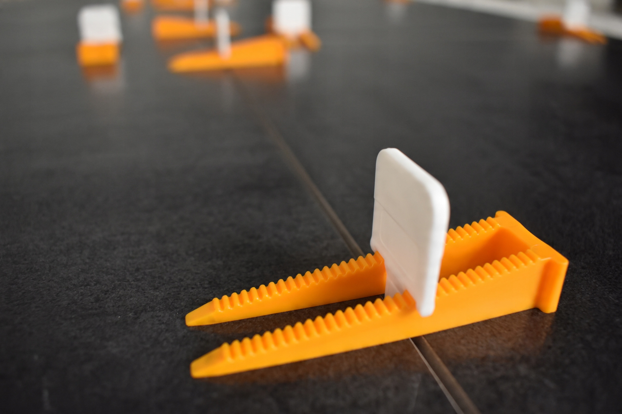 Благодаря зажимам и клиньям плитка выравнивается самостоятельно. Поэтому даже человек, укладывающий плитку впервые, получит идеально ровную поверхность.