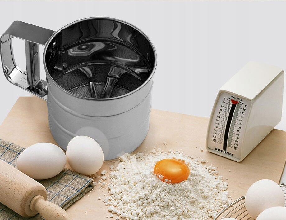 КРУЖКА С ТЕЛКИМ СИТОМ И ПОДВИЖНОЙ РУЧКОЙ ДЛЯ ПРОСЕИВАНИЯ МУКИ, САХАРНОЙ ПОРОШКИ, КАКАО И ДРУГИХ сыпучих продуктов.