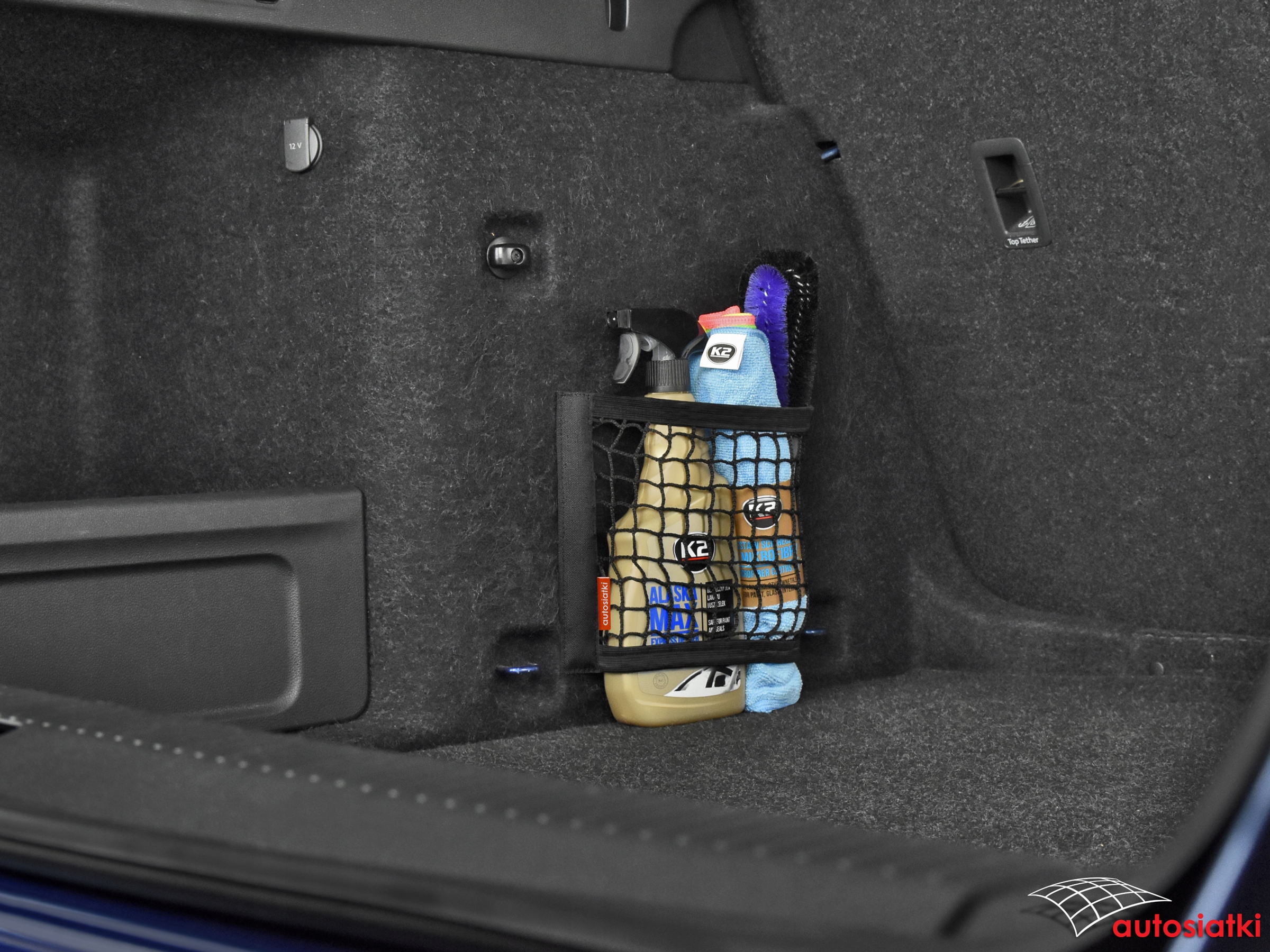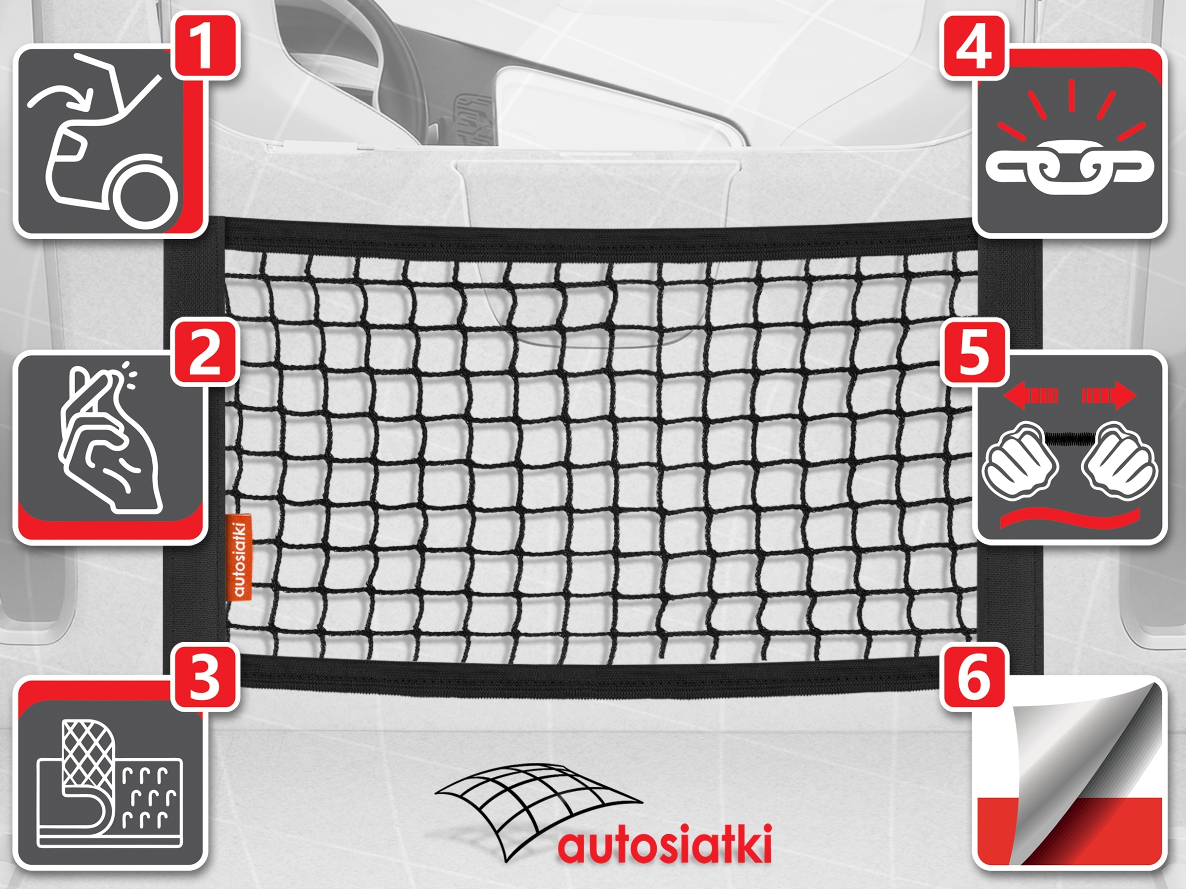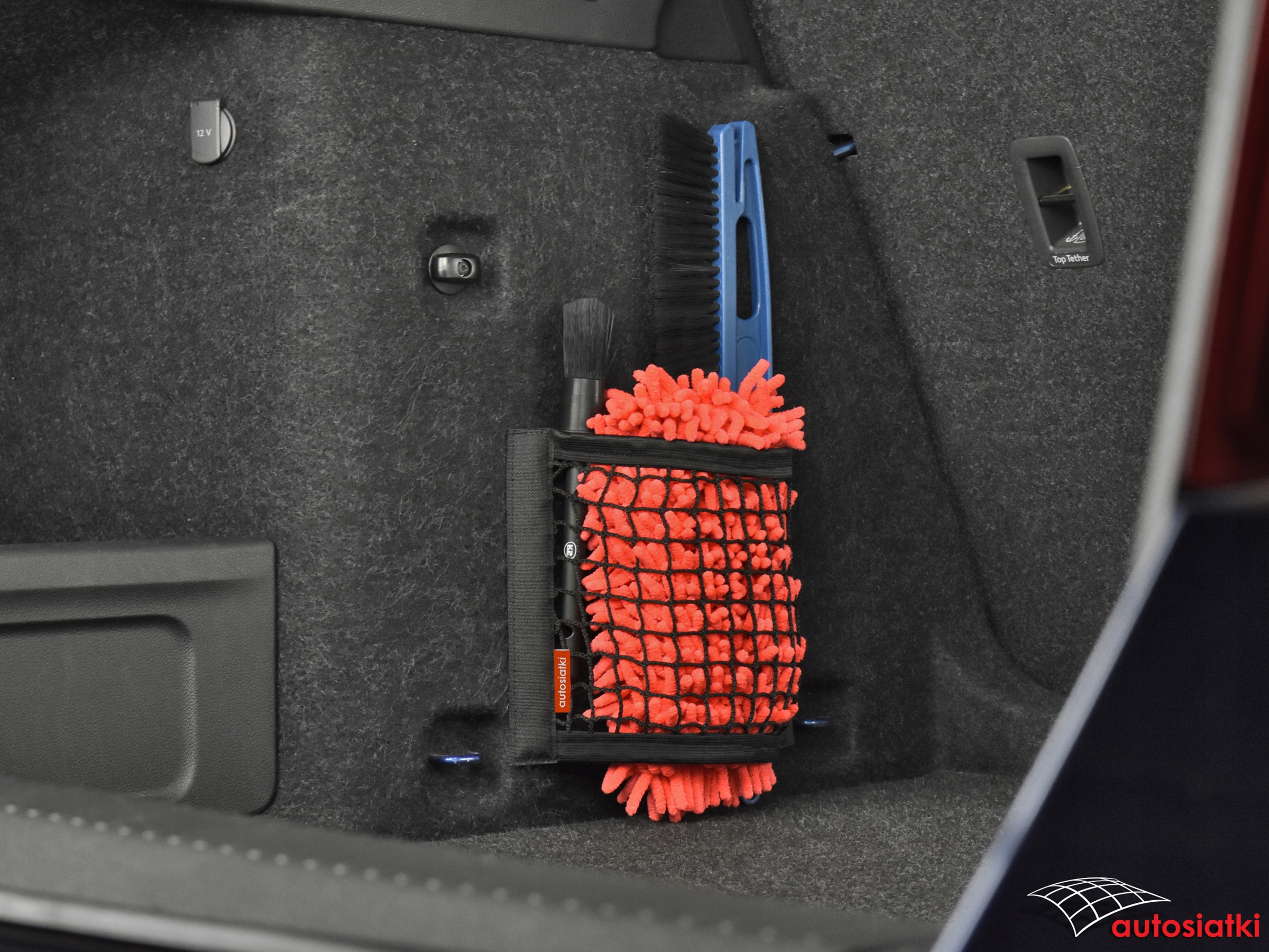 Это прочная сетка с лентой-липучкой по бокам. Отделка гибкой резиной сверху и снизу, что позволяет подогнать сетку под транспортируемые предметы. Ограждение крепится к ковру в багажнике или салоне автомобиля.