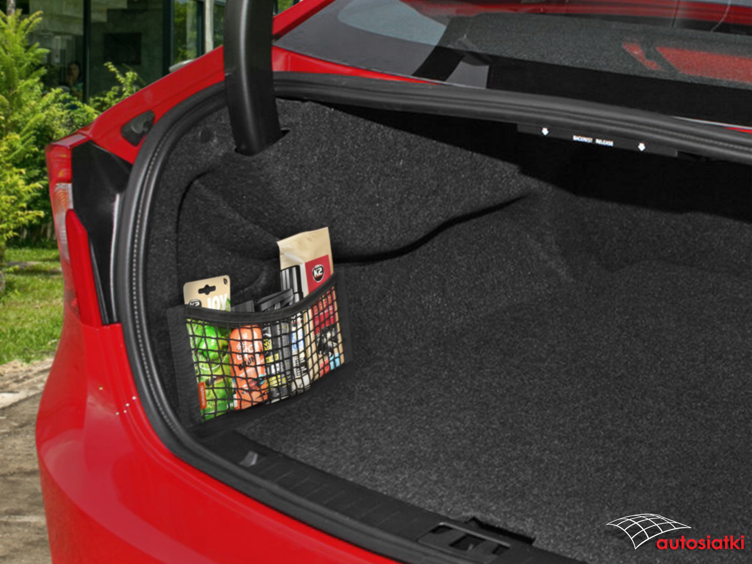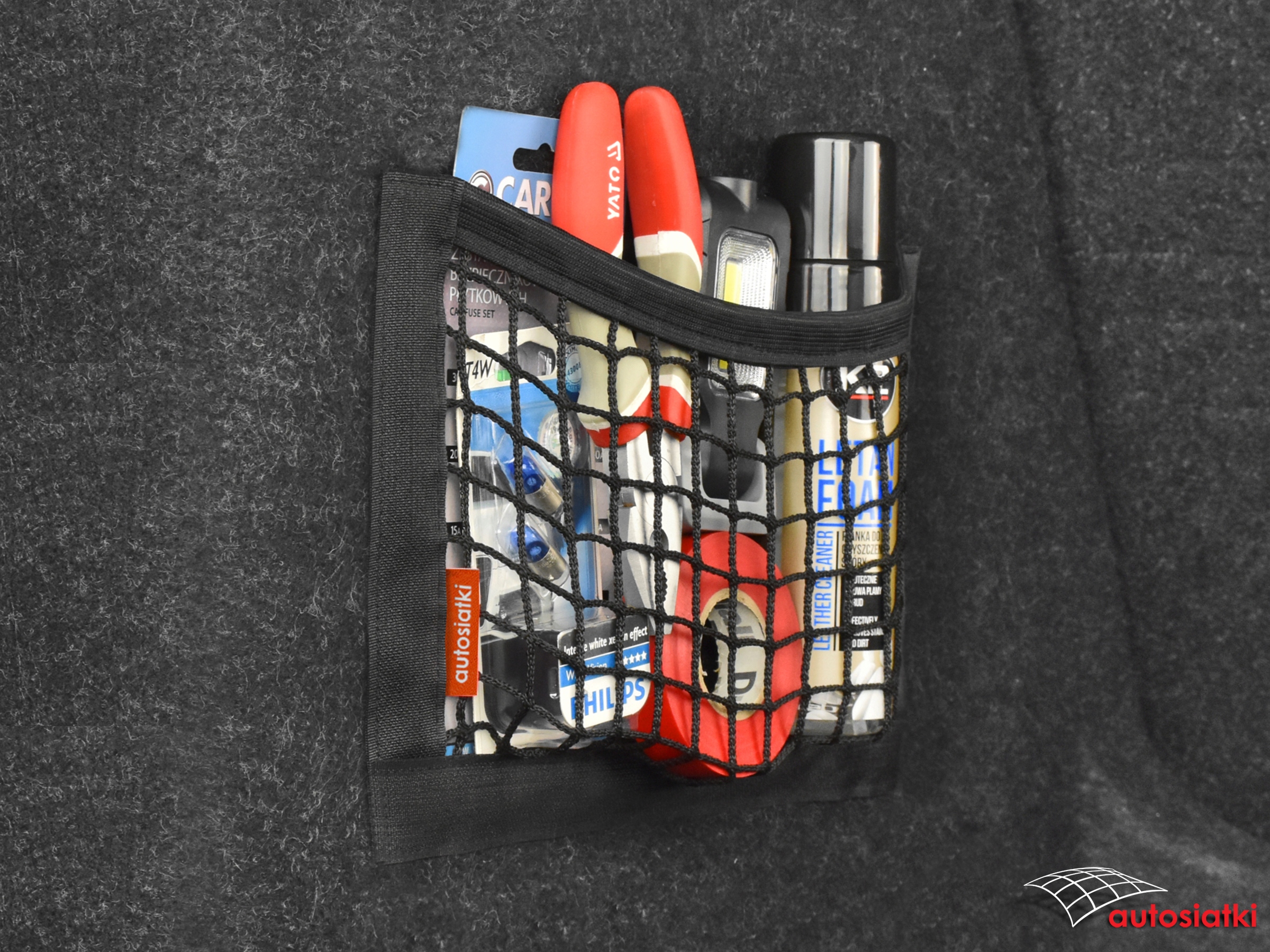 Это прочная сетка, покрытая лентой-липучкой снизу и по бокам. Верхняя часть покрыта резиной, которая фиксирует и защищает аксессуары от перемещения. Карман крепится на коврик в багажнике или салоне автомобиля.