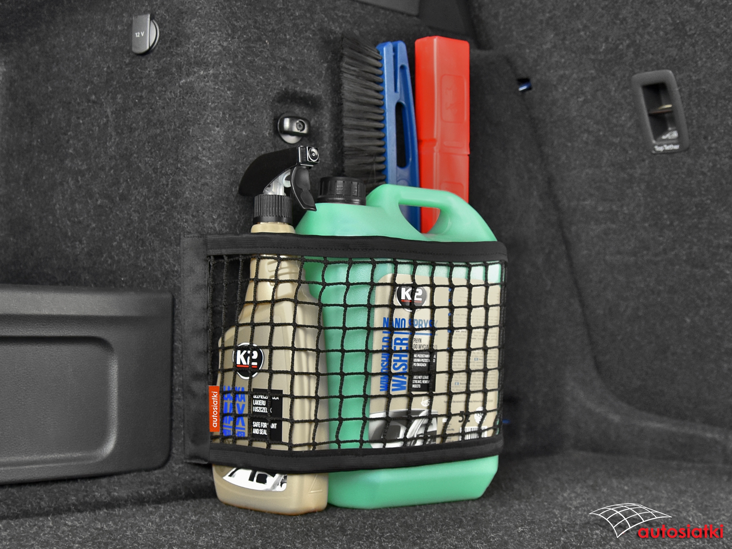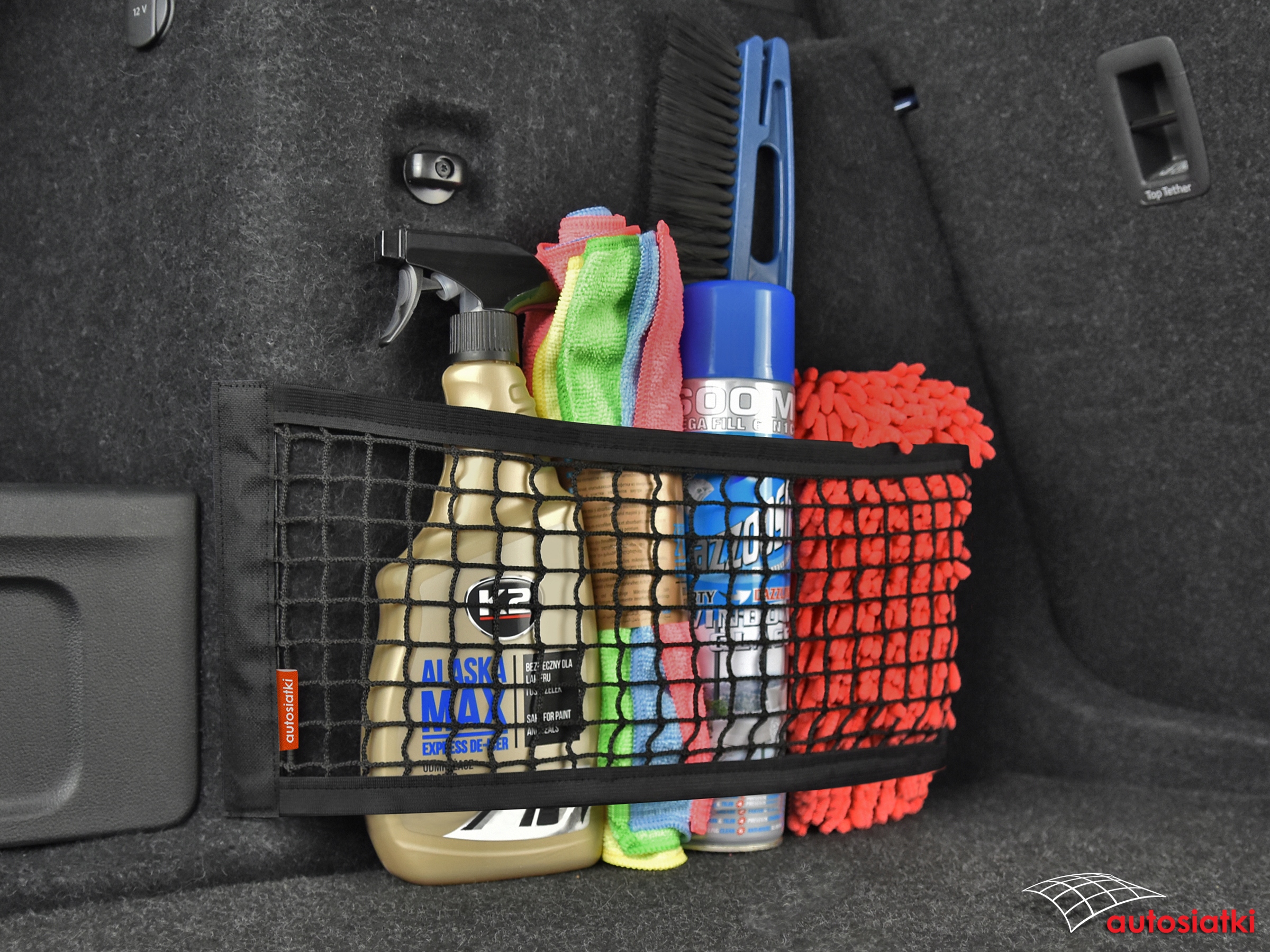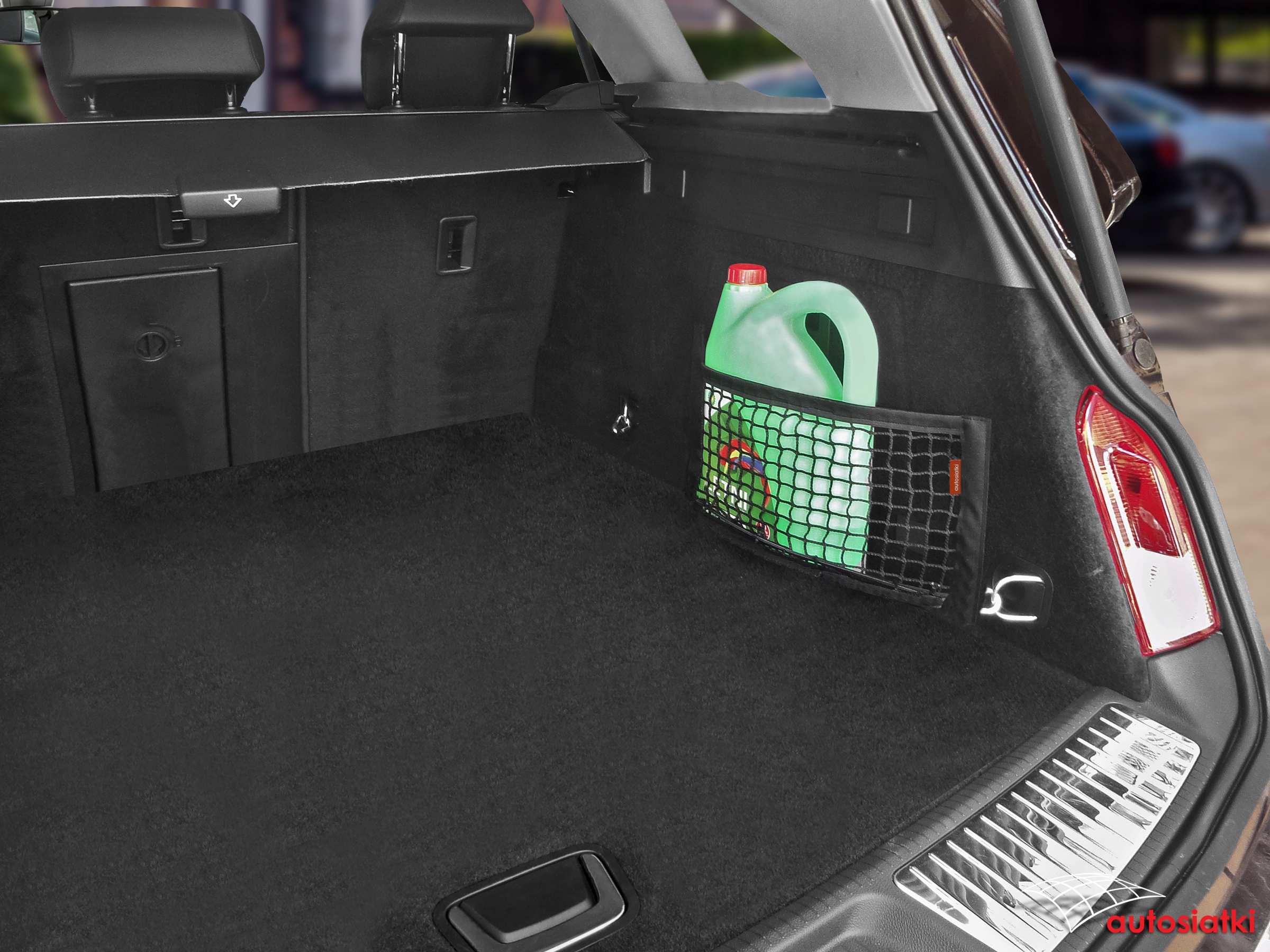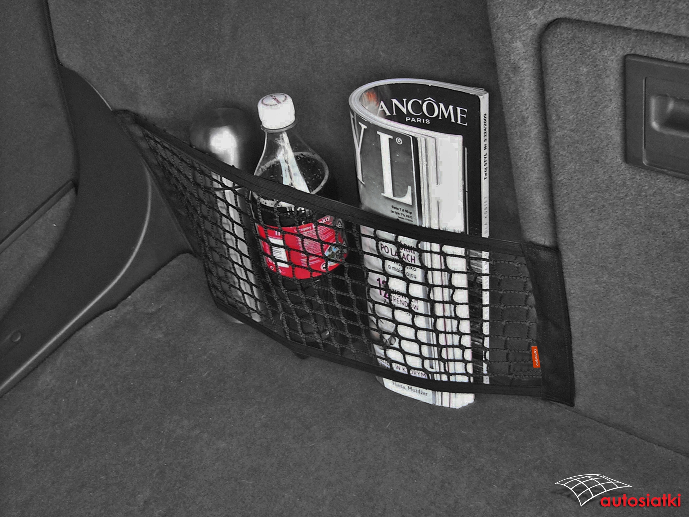 Это прочная сетка с лентой-липучкой по бокам. Отделка гибкой резиной сверху и снизу, что позволяет подогнать сетку под транспортируемые предметы. Ограждение крепится к ковру в багажнике или салоне автомобиля.