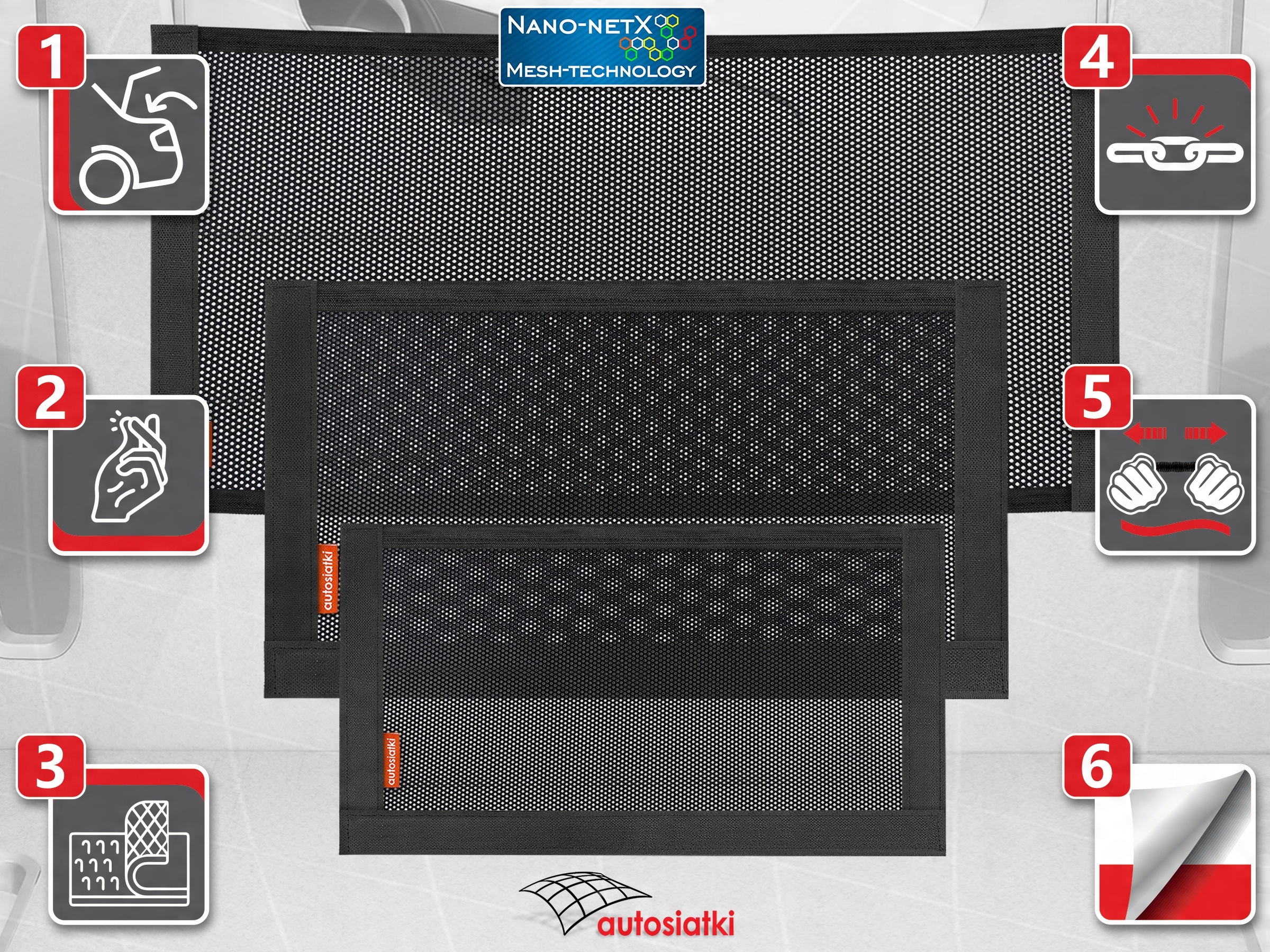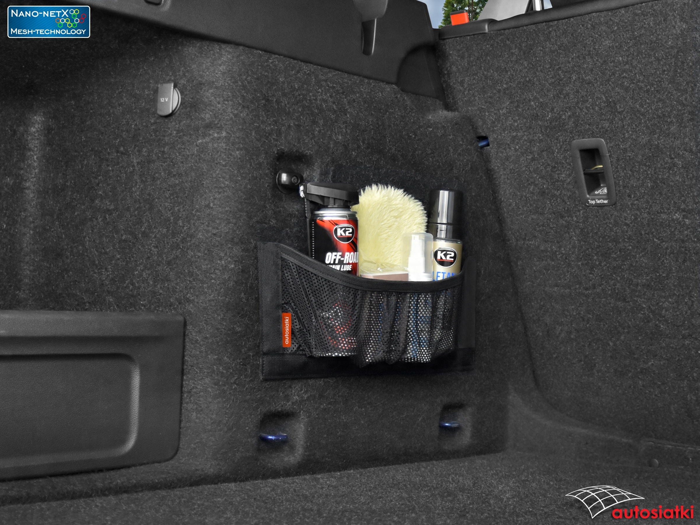 Это автомобильные органайзеры из сетки Nano-NetX, крепящиеся к обивке с помощью ленты-липучки. Карман с трех сторон прикрыт липучкой, резинка только сверху. Забор отделан лентой только по бокам, но сверху и снизу имеет резинку. Используемая Mesh-Technology сетка имеет очень мелкие ячейки, которые защищают даже небольшие предметы от выпадения.