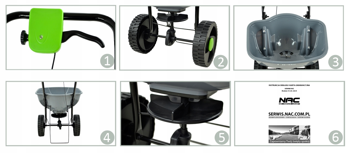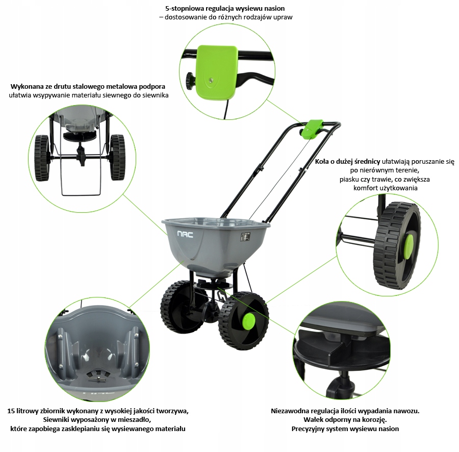 NAC Диссертер, предназначенный для распространения искусственных удобрений, семян на газонах и домашних садах, а также в зимнем песке, соле, свободном оттаивании агентов на подъездных путях, дорожках, переулках и т. Д. Максимальная ширина рассеяния составляет до 250 см. Ширина распространения зависит от скорости, с которой мы перемещаем распределитель, что позволяет точно определить ширину посева.