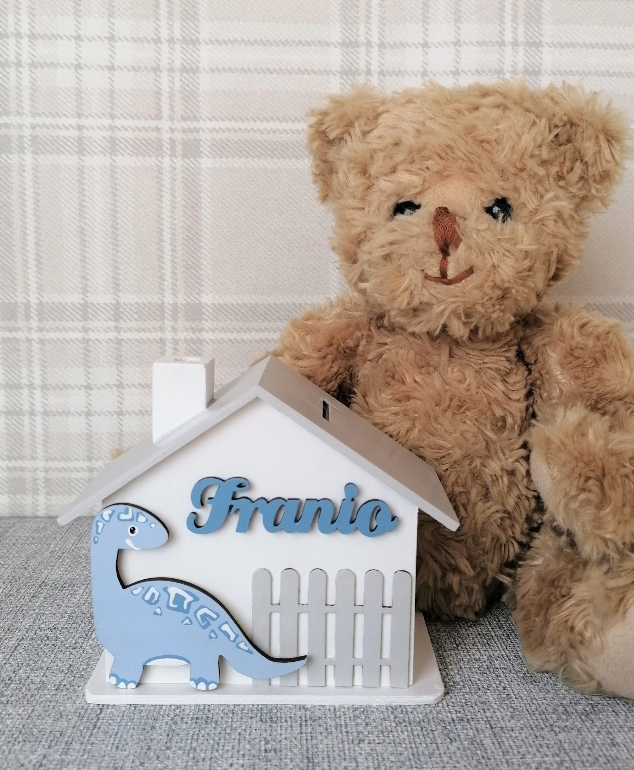 Деревянная копилка, расписанная вручную в виде домика, станет прекрасным подарком каждому ребенку на разные случаи жизни. В передней части копилки имеется ограждение и декор, расписанный вручную. Вверху, на видном месте, деревянная надпись с именем ребенка.