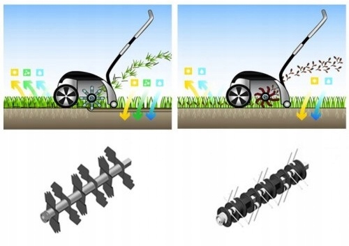 Бензиновый аэратор AL-KO имеет в комплекте два рабочих ролика: аэрационный и скарифицирующий. Изменение режима работы устройства со скарификатора на аэрацию и наоборот осуществляется путем ручной замены, без использования инструментов рабочего валика. Скарифицирующий каток имеет 14 ножей, которые весной подстригают газон и удаляют свалявшийся газон, остатки растений и мох. Аэрационный вал имеет по окружности 24 стальные пружины, которые прекрасно аэрируют газон весной и осенью.