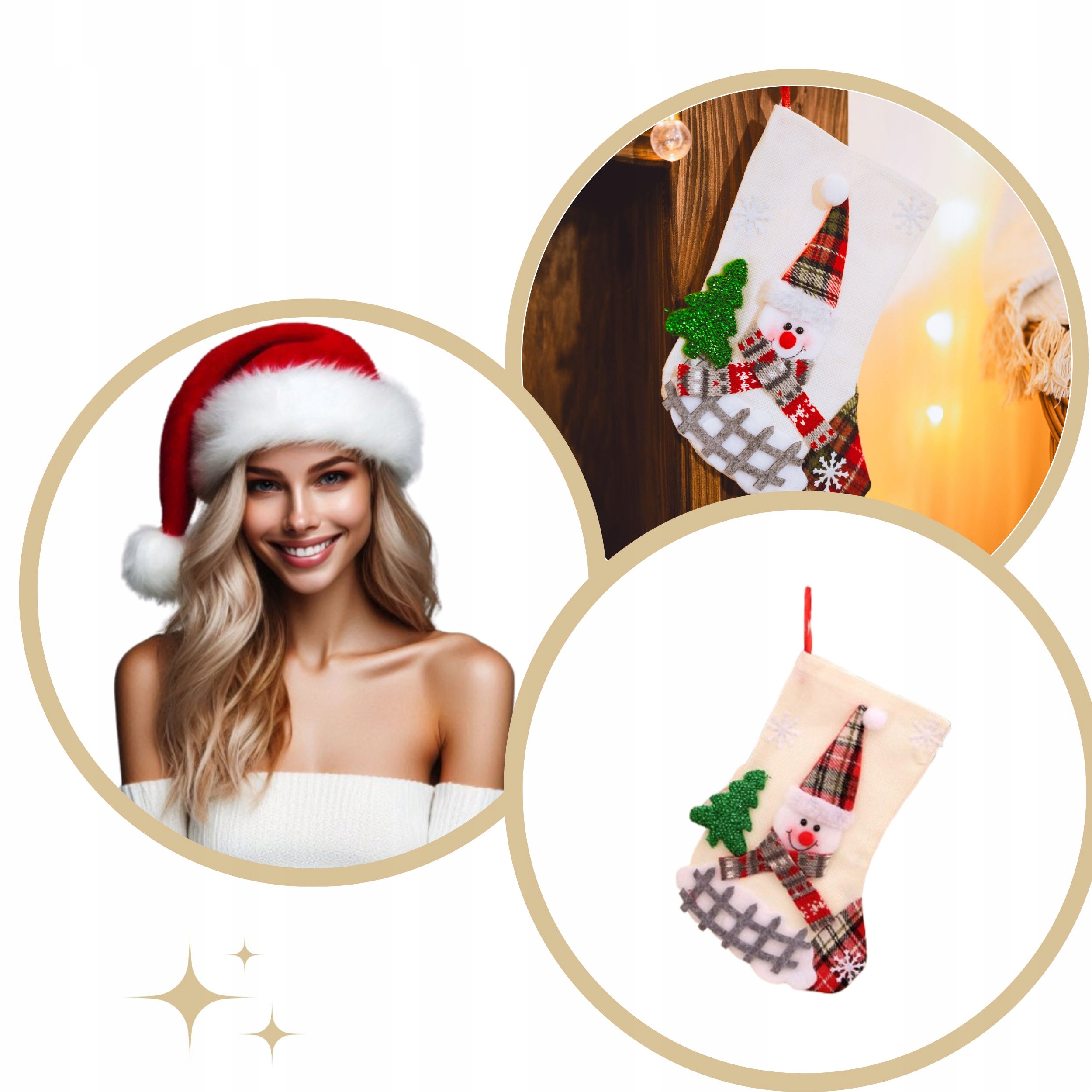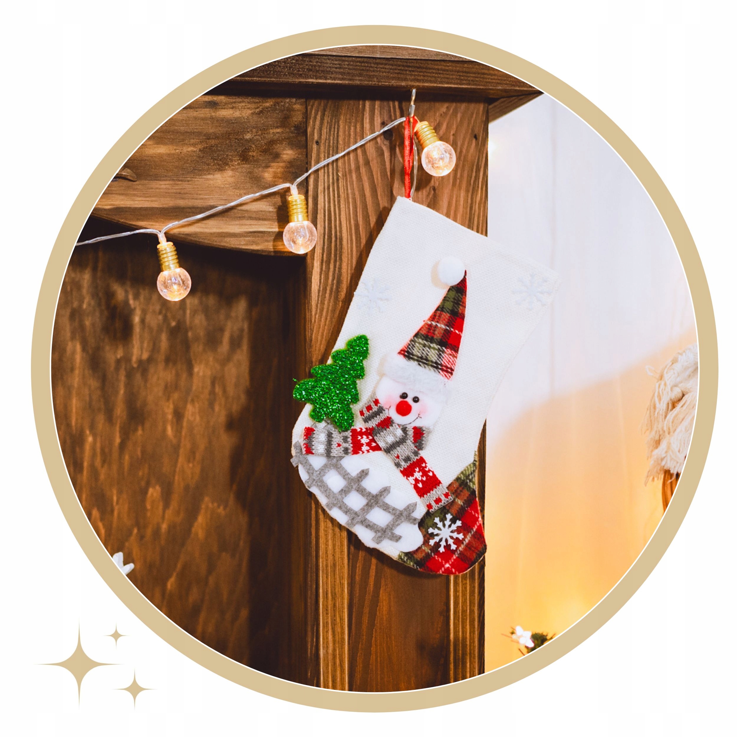 Skarpeta świąteczna LNIANA z bałwanem biała na PREZENTY kominek OZDOBNA