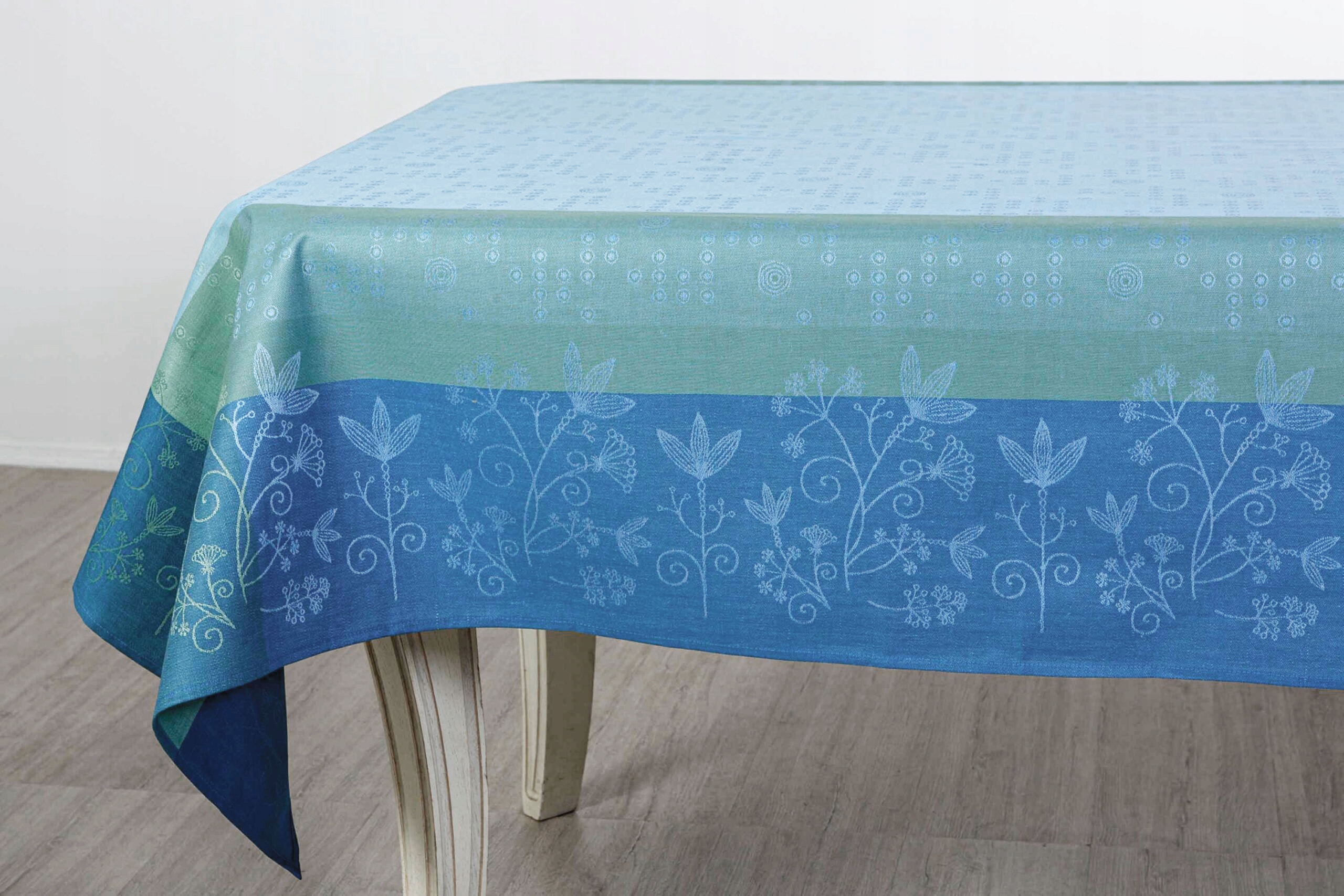 Современная скатерть 155х250 см из льняно-хлопковой жаккардовой ткани. Изысканная скатерть большого размера на каждый день и для особых случаев. Благодаря узорам полевых цветов и приглушенным оттенкам синего с нежным оттенком бирюзы создается гармония и визуальная легкость. Скатерть напоминает свежесть ясного неба и покой цветущего луга. Правильно подобранные яркие аксессуары подчеркнут характер стиля.