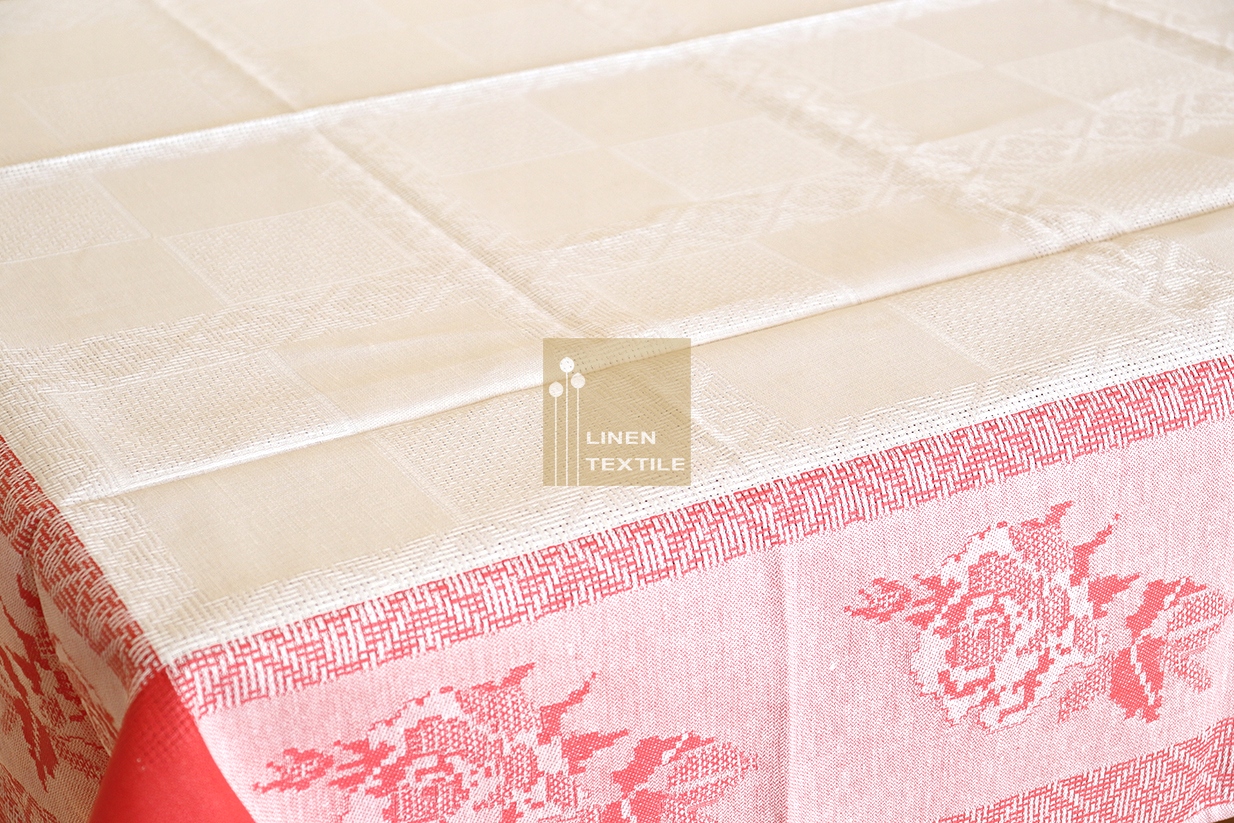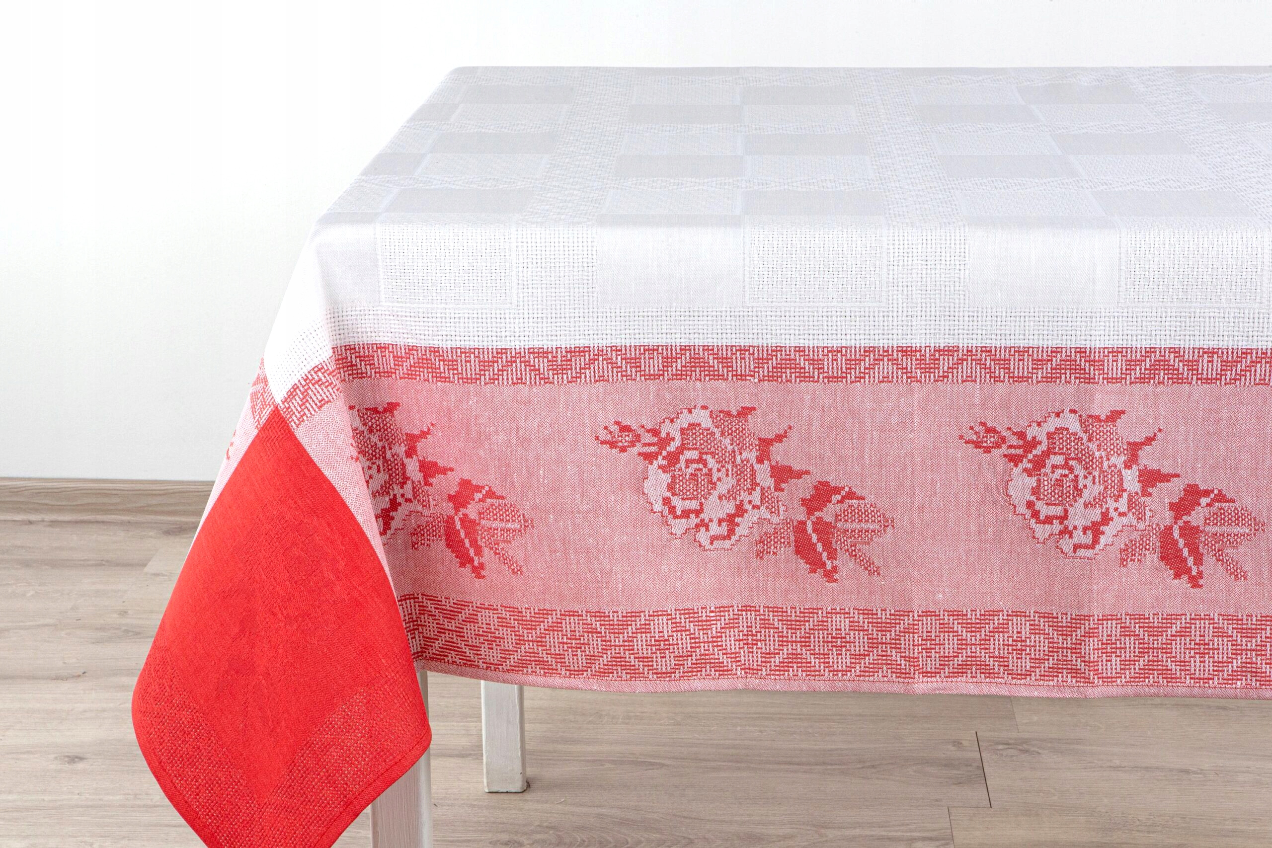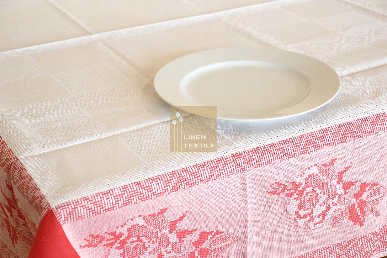 Прямоугольная льняно-хлопковая жаккардовая скатерть 150х200 см. Эксклюзивная большая скатерть для гостиной или обеденного стола. Скатерть-роза имеет свое очарование и добавит праздничной атмосферы любому торжеству. Скатерть сочетает в себе свежесть белого с теплыми тонами красного, содержит интересное переплетение и растительный орнамент. Все это создает потрясающий эффект. Он эффектно обогащает интерьер, дает красивый фон посуде, разнообразит пространство красками. Он порадует всех гостей!