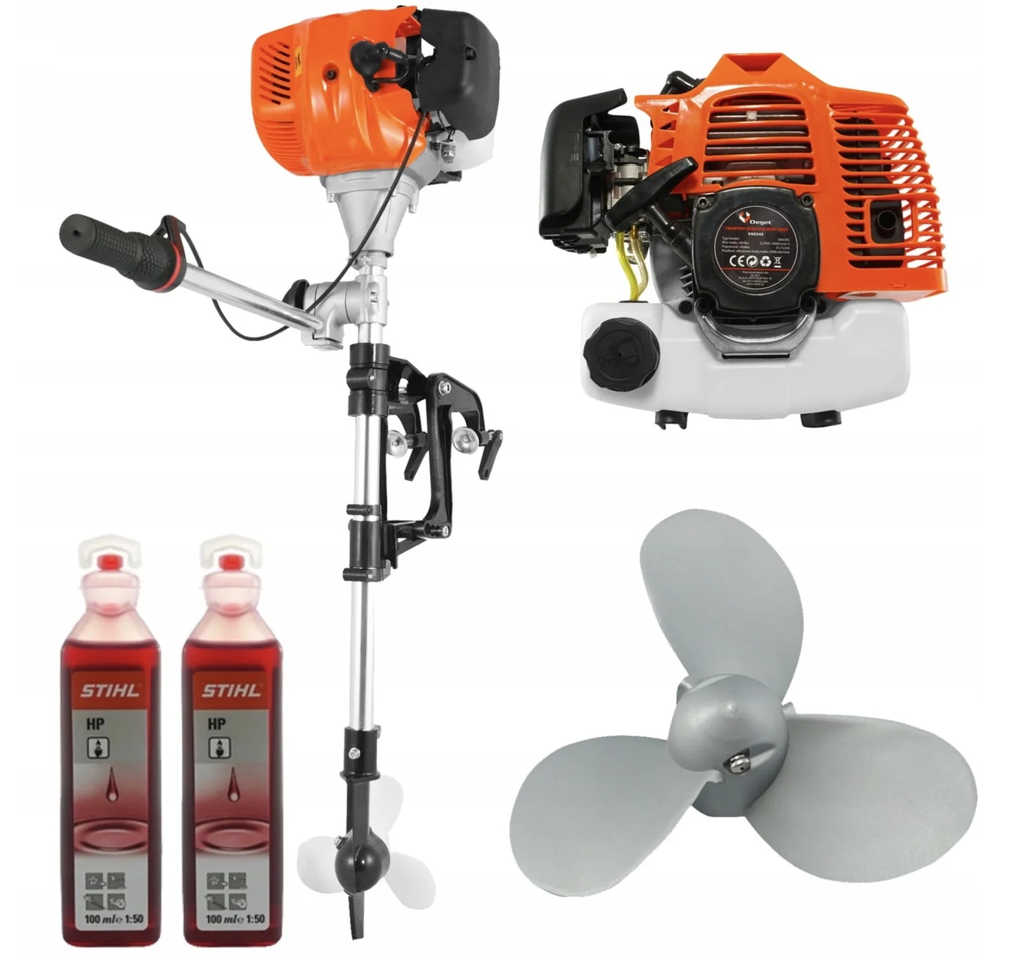 Подвесной двигатель внутреннего сгорания DEGET представляет собой устройство, предназначенное для использования на понтонах и небольших лодках. Двухтактный двигатель объемом 51,7 см³ и мощностью 5,2 л.с. Устройство имеет небольшие размеры, что является преимуществом в случае небольших понтонов и облегчает хранение двигателя вне сезона. Благодаря простой и прочной конструкции устройство легко использовать и обслуживать. Воздушное охлаждение устранило проблему с крыльчаткой водяного насоса и перегревом. Регулируемое крепление к транцу значительно облегчает установку. Привод передается центробежной муфтой. Управление осуществляется рычагом, расположенным на румпеле, угол наклона которого регулируется без инструментов. Дополнительный винт в комплекте.