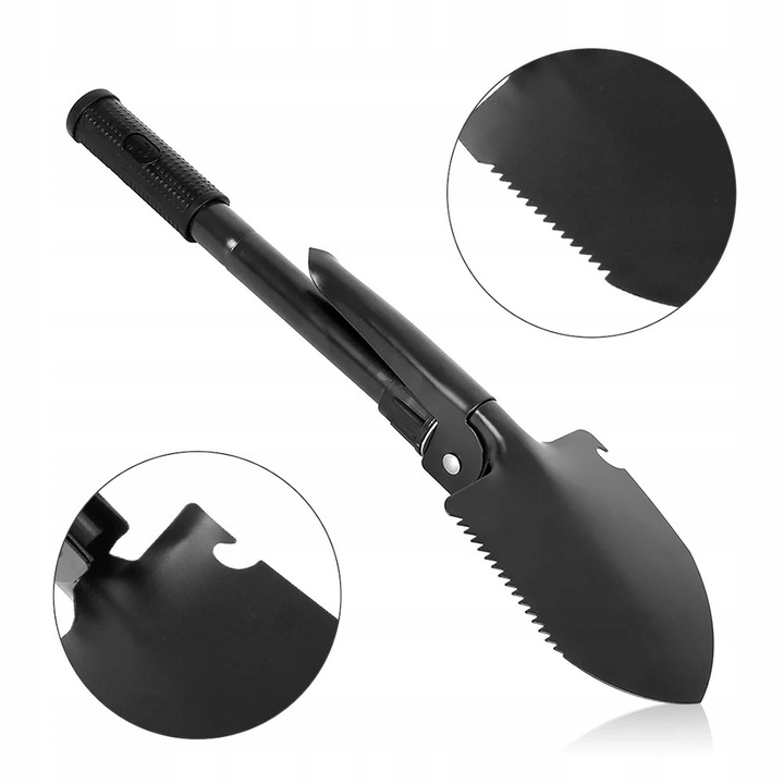 Складная лопата 4-в-1 — многофункциональное устройство, которое идеально подходит для кемпинга, многодневных поездок с друзьями, выживания, а также дома. Множество функций в одном инструменте: лопатка, кирка, пила, открывалка. Благодаря складным элементам он компактен и удобен в переноске. Резиновая ручка позволяет лопате хорошо и надежно лежать в руке.